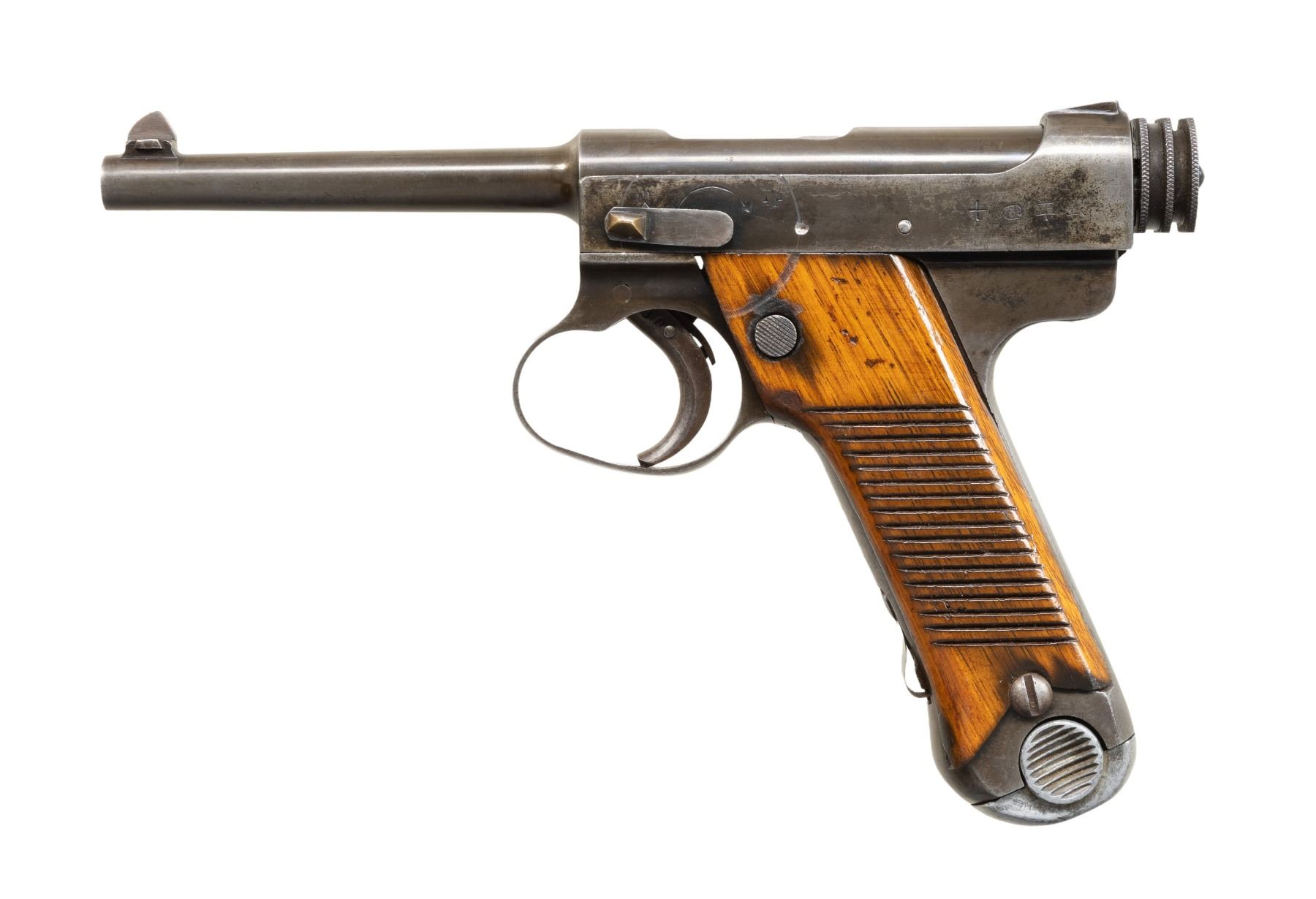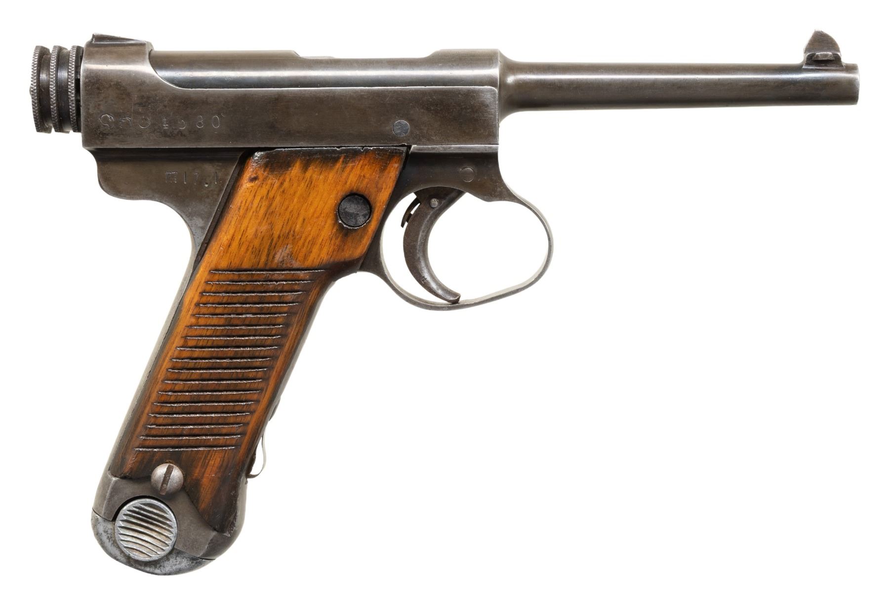NAMBU SEMI-AUTOMATIC PISTOL. Cal. 8mm Nambu. S# 4580. Bbl. 4 9/16". Type 14 Nambu semi-automatic pistol mfg. at the Kokubunji factory under Nagoya supervision in January of 1942. Left side of the frame exhibits Kanji characters denoting the model designation, with the Nagoya / Kokubunji arsenal insignia, Series I symbol, S#, and Showa date code "17.1" marked on the right. Metal components exhibit a blue finish (which appears to have been polished at one time), save for on some small parts, which are strawed. Bolt assembly and locking block are polished in-the-white. Frame is mounted with sanded and refinished 2-piece grooved wood grips. Standard dovetailed blade front sight and integral frame square notch rear sight. Large pattern trigger guard and grooved cocking knob. All serialized parts are matching and include the frame, mag. safety, mag. release button, trigger guard, trigger, bbl. extension, locking block, and cocking knob, with remaining parts being unnumbered. MAGS: x1 non-matching (S#: 169) blued steel 8-rd. CONDITION: metal components retain traces of their original arsenal blue finish, exhibiting wear and thinning overall that has faded to gray and mottled gray patinas. Original arsenal markings have been noticeably softened due to polishing. Bore is bright, exhibiting scattered spots of light pitting and scattered spots / small patches of moderate pitting towards the muzzle, while retaining good rifling throughout. Proper manual mechanics. Grips show scattered marks and impressions from handling and storage, with the usual drag line present on the left panel from the safety lever. (25-6571/MLW). CURIO. $300-500.