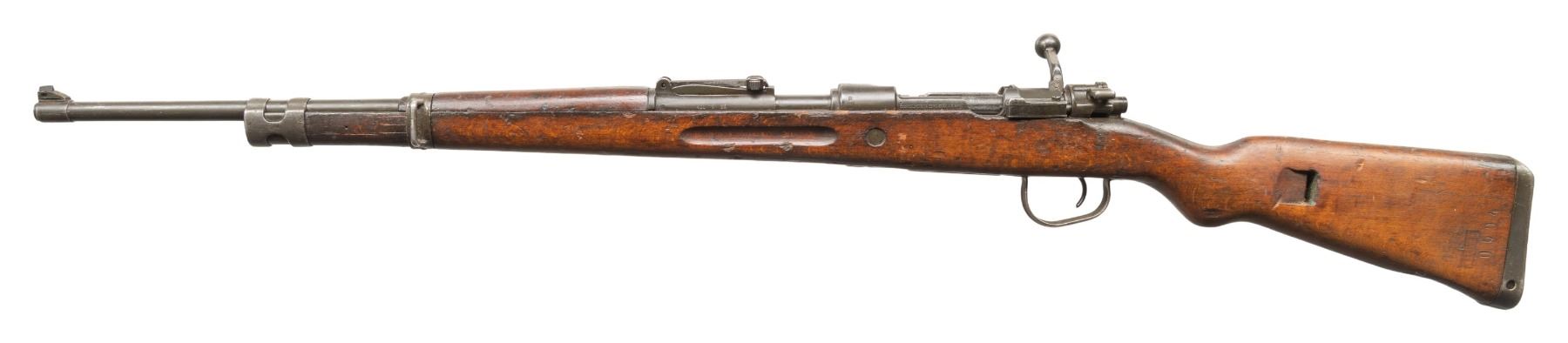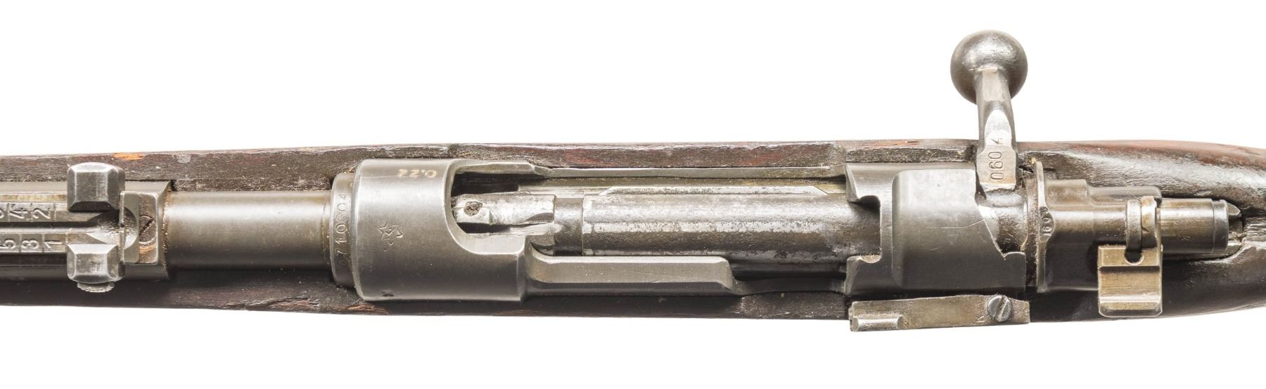 Cal. 22 LR. S# 0710604. Bbl. 24". Blade front sight. K98k style tangent rear sight graduated to 2000m. Matching numbers on receiver, stock, bolt handle & trigger guard with parts appearing arsenal force matched. Post-war Czech K98 style single shot training rifle. Receiver ring has Israeli Star of David marking. Left side of receiver has post war Brno markings. Phosphate finish. Beech stock set with finger grooves, left sling provisions & "0.22" brand on underside of butt. CONDITION: stock shows some missing material where the "0.22" brand is no doubt a result from this marking. Stock otherwise shows a divot behind upper tang from improper bolt disassembly, light band removal wear on forend, some chipping, staining, scattered dings, scratches & handling marks. Metal retains about 60% arsenal rework phosphate with some notable pitting on front band, further scattered light pitting, edge wear, handling marks & some oxidation. Action functions properly when hand cycled. Very good plus bright bore. PROVENANCE: From the PMRB Collection. (25-5814/MJC). CURIO. $300-500.