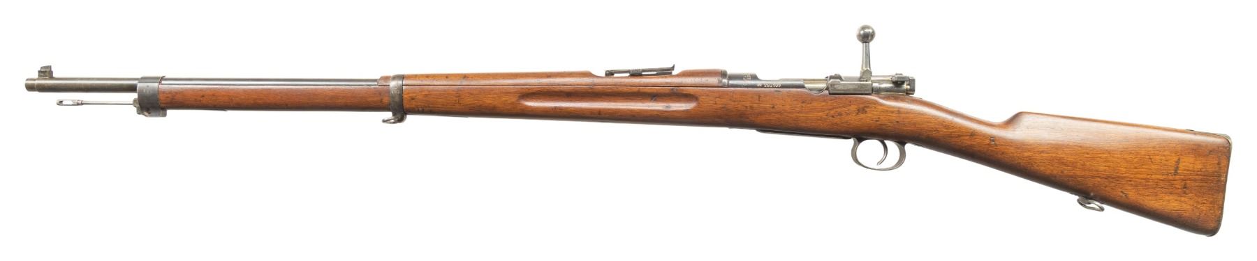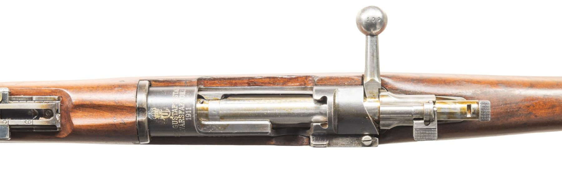 Cal. 6.5x55. S# 283109. bbl. 29" with Century import marking. Standard Swedish M96 sights with stuck rear sight elevator. Cleaning rod is mismatched but all over visible numbers are matching to the receiver. Receiver ring has 1911 date with Carl Gustafs markings. Arsenal blue marking with scattered old touch up & some added white highlight. Hardwood stock set with bottom mounted sling swivels. Cleaning rod present. Right side of butt has vacant area where data plate once was & "2" for bore condition on stock disc. CONDITION: sanded stock has added finish with scattered handling marks & dings. Metal is mostly a dull gray likely from old touch up finish with scattered traces of arsenal blue, some light scratches on bottom metal, scattered oxidation, edge wear & handling marks. Action is functional when hand cycled but sluggish due to large amount of cosmoline present. Bore shows some frosting but strong rifling. (25-5236/MJC). CURIO. $300-500.