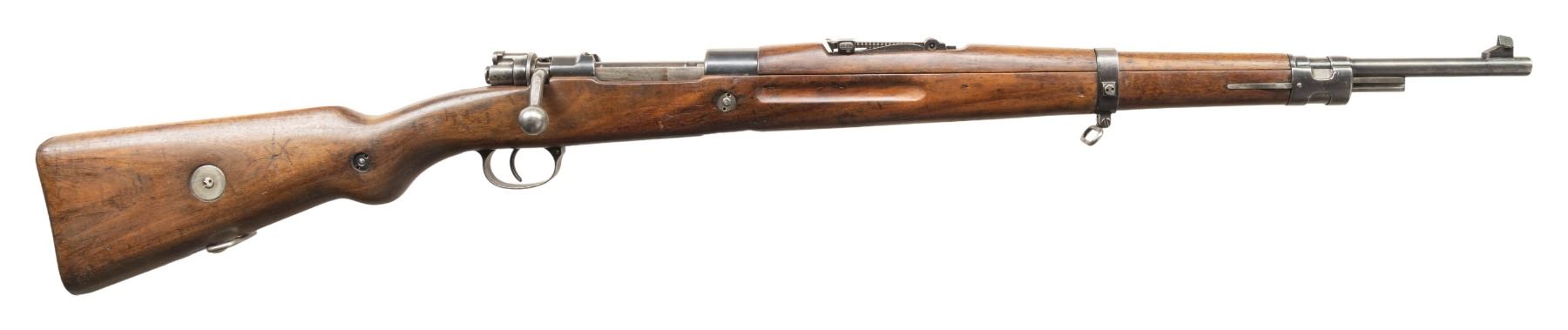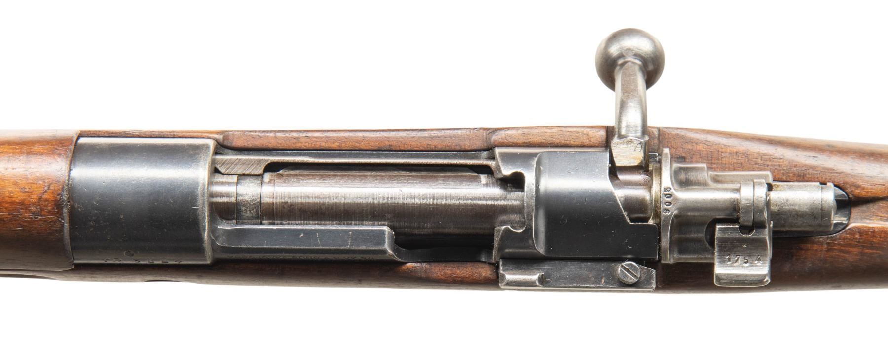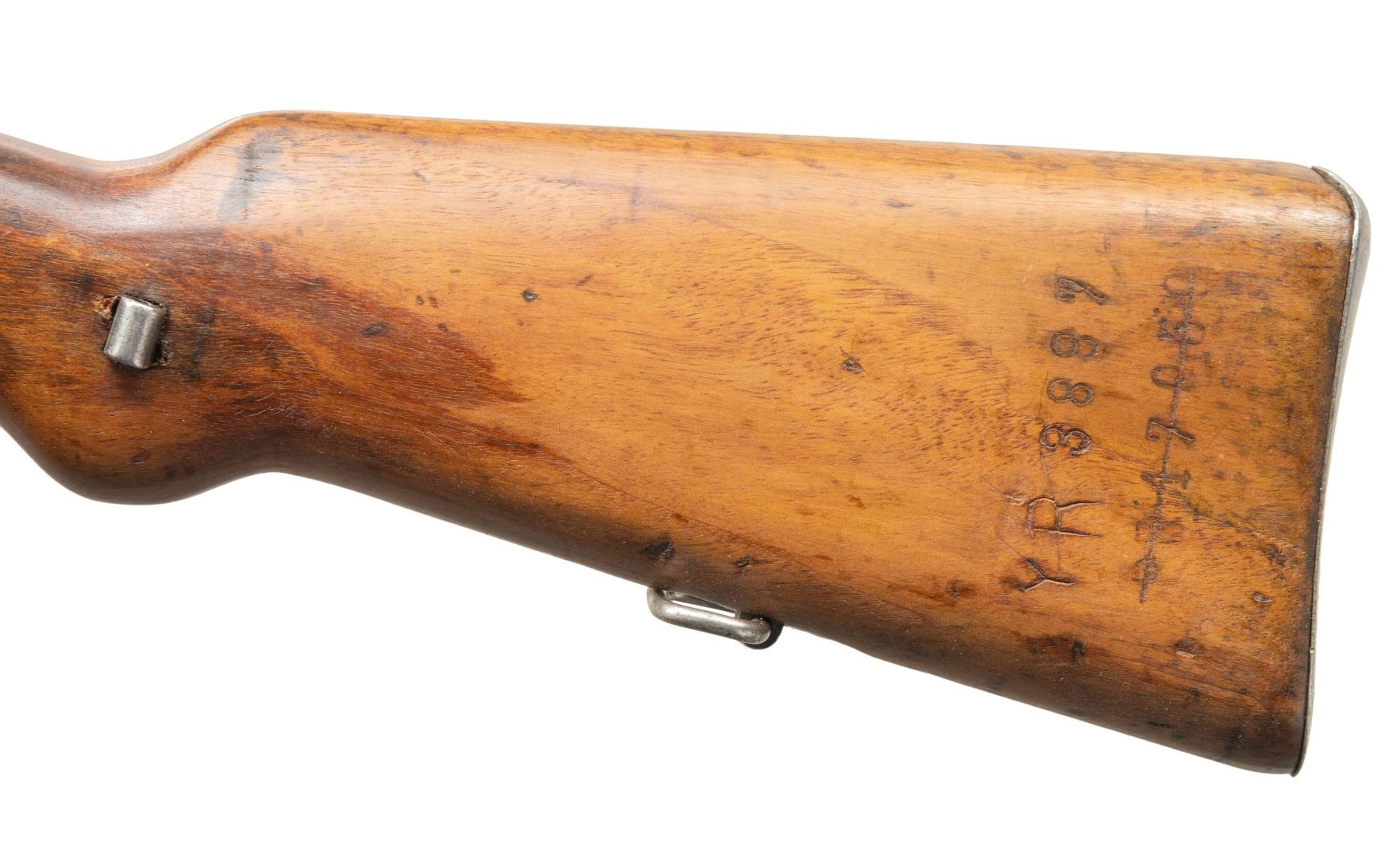 Cal. 8mm Mauser. S# YR3887. Bbl. 23 1/2" with Century import marking. Standard VZ-24 sights with slotted front sight hood. Top of bbl. ahead of front sight has a saw added slot that does not go through & is likely related to sight hood. Left side of butt has been renumbered to match receiver. Bolt is from a German K98k & it has been renumbered but does not match receiver. Receiver ring has scrubbed crest. Arsenal rework blue finish. Hardwood stock set with bottom mounted sling swivels. No cleaning rod present. CONDITION: stock has been sanded & oiled & it shows a light carving on right side of butt, some light chipping scattered dings, finish loss & handling marks. Metal retains 50% arsenal rework blue with overall edge wear, scattered fading to gray, light oxidation & some dings on bottom metal. Action functions properly when hand cycled. Bore has been counterbored a couple inches at muzzle & shows oxidation & pitting with worn rifling. (25-6594/MJC). CURIO. $300-500.