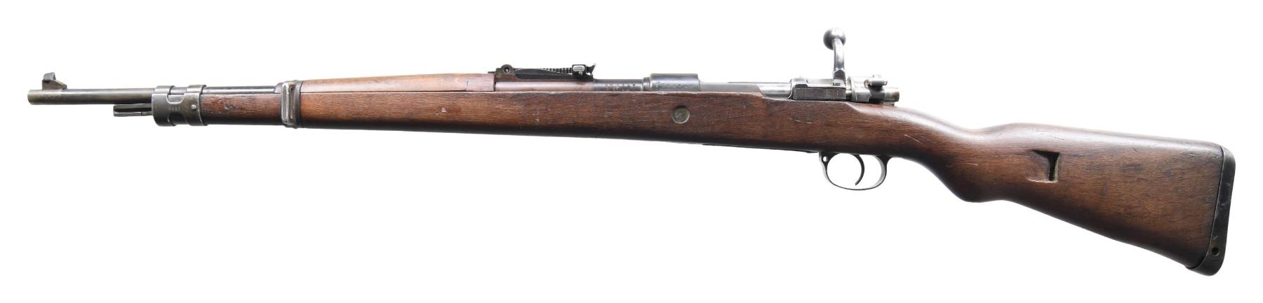 Cal. 8mm Mauser. S# SR3347. Bbl. 23 1/2". Blade front sight. Tangent rear sight graduated to 2000m. Matching numbers on receiver, bbl. & altered turn down bolt handle. Bolt handle number is renumbered & in a modern font. Other visible parts are mismatched or unnumbered. Romanian VZ-24 modified to partly resemble an SS contract K98k. Receiver top has spurious "bnz (Rune)" 4 markings. Left side of receiver & bbl. have spurious WW2 German proof markings. Blued finish. K98k style stock set with left side sling provisions. Cupped buttplate is proud of wood. No cleaning rod present. CONDITION: sanded stock set has spliced repair at rear of handguard, scattered dings & handling wear. Metal shows a mix of blue finishes including cold blue that are fading to gray with oxidation & edge wear. Action functions properly when hand cycled. Muzzle has a counterbore that appears to be a couple inches in the length. Bore otherwise shows scattered light pitting & frosting. (25-2201/MJC). CURIO. $300-500.