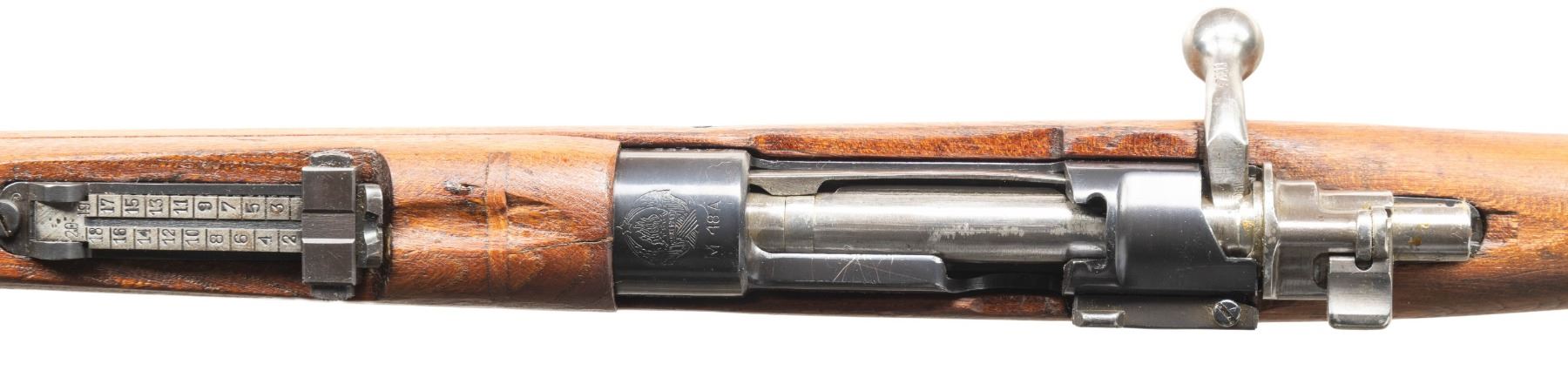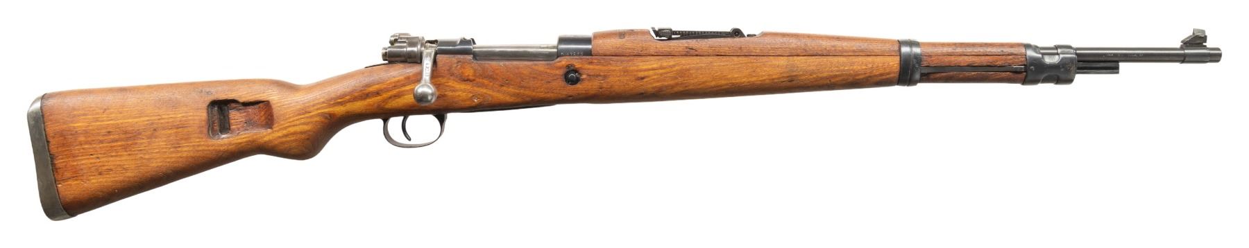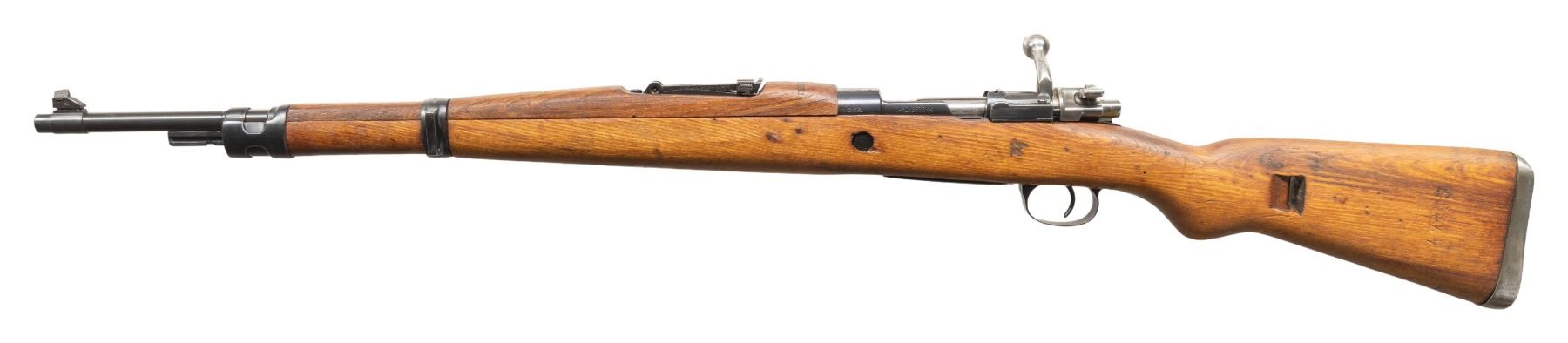 Cal. 8mm Mauser. S# P47233. Bbl. 23 1/2" with Cole Dist. import marking. Standard M48 sight. Front sight is slotted for hood but no hood present. Bolt handle, stock & floorplate have arsenal force matched numbers. Receiver ring has Communist crest & M48A marking. Blued finish. Elm stock set with left side sling provisions. No cleaning rod present. CONDITION: stock set has a cleaned appearance with an armorer splice repaired crack at rear of handguard, a few small drying cracks on butt, a couple small chips, scattered dings & handling marks. Metal retains 97% arsenal rework blue with some edge & handling wear. Action functions properly when hand cycled but appears to be full of cosmoline. Bright near excellent bore. (25-6597/MJC). CURIO. $300-500.