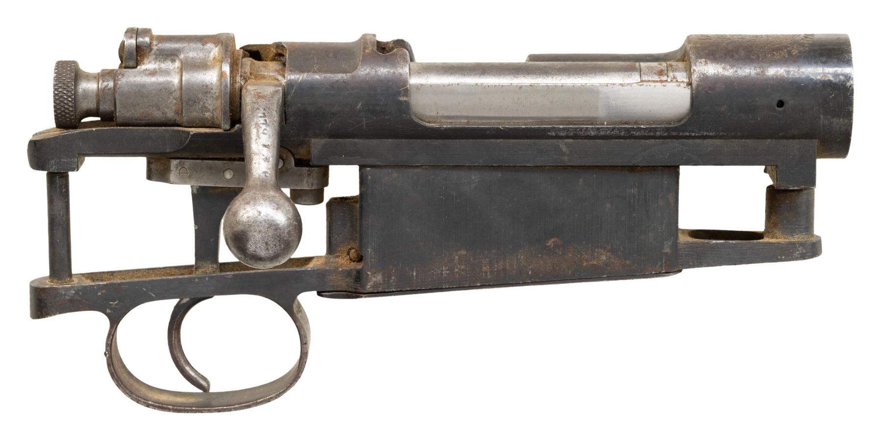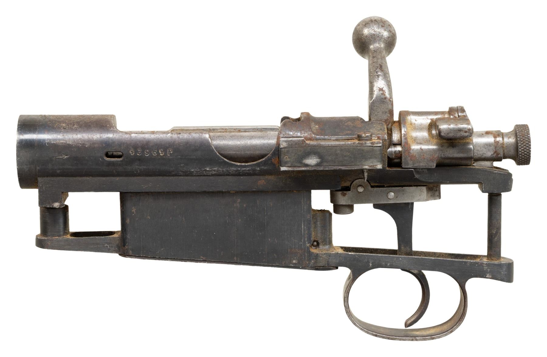 S# 43969P. 1941 dated Mexican 1936 Mauser receiver with complete but mismatched bolt assembly, trigger, trigger guard, magazine assembly, follower & action screws. CONDITION: metal shows overall moderate oxidation & some scattered edge wear. PROVENANCE: Norman Olliff Estate. (25-6140/MJC). MODERN. $100-150.