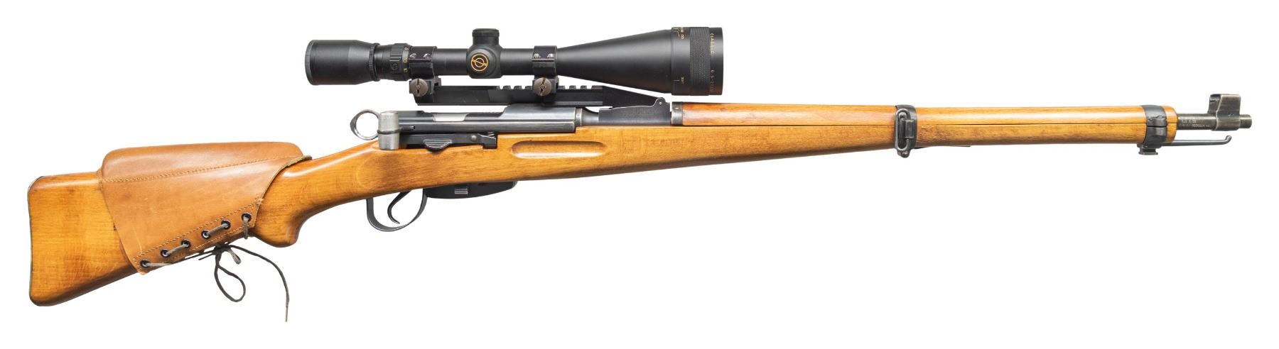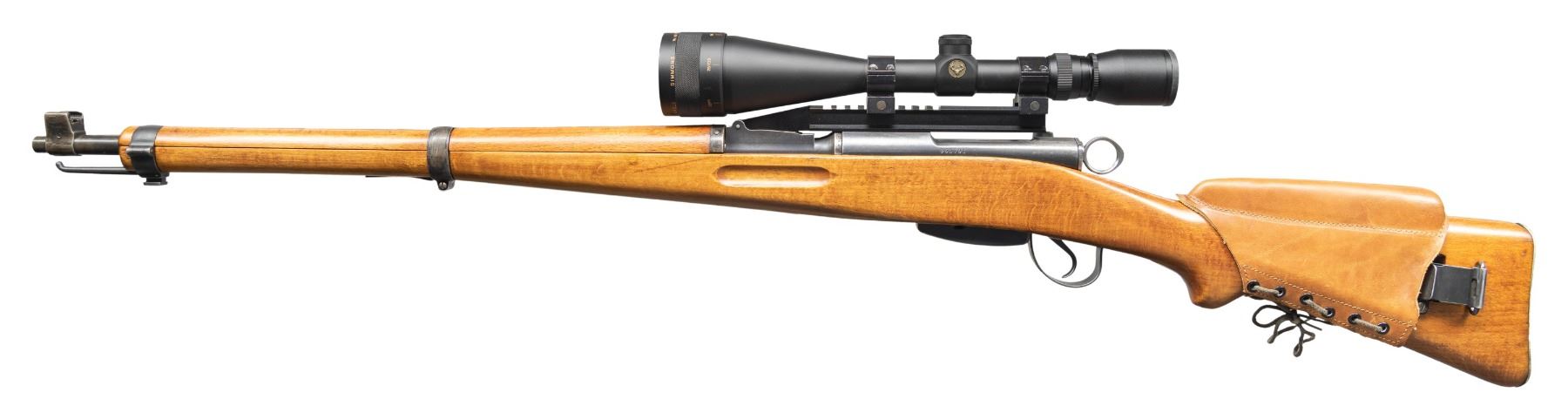 Cal. 7.5x55. S# 965791. Bbl. 25" with Century import marking. Standard K31 front sight. Rear sight removed & has aftermarket scope mount that appears to be a none drilled & tapped type with Simmons WhiteTail Classic 6.5-20x power scope. Scope has duplex crosshair reticle, very good optics & bikini cover. Blued finish. Beech stock set with reversed front sling swivel & aftermarket leather cheekpiece. MAGS: 1-6 rd. matching. CONDITION: sanded stock set has added finish with a small crack at heel, some handling marks & dings. Metal retains 50% arsenal & touch up blue with bands being a smoky gray color, notable edge wear on receiver & some light oxidation. Action functions properly when hand cycled. Bright near excellent bore. (25-5619/MJC). CURIO. $300-500.
