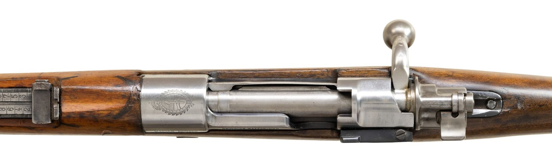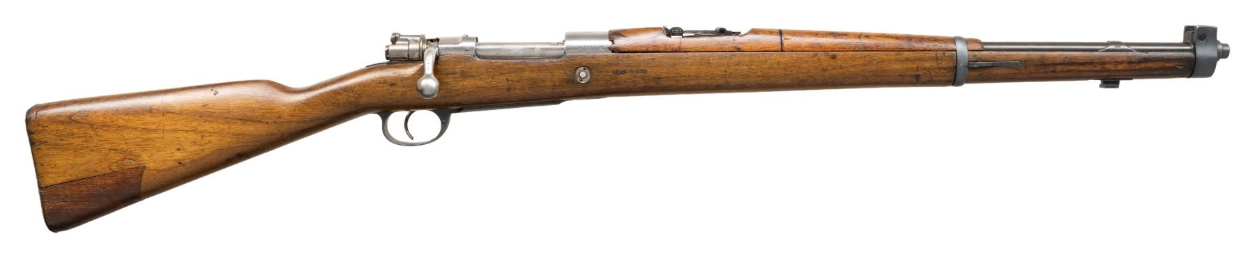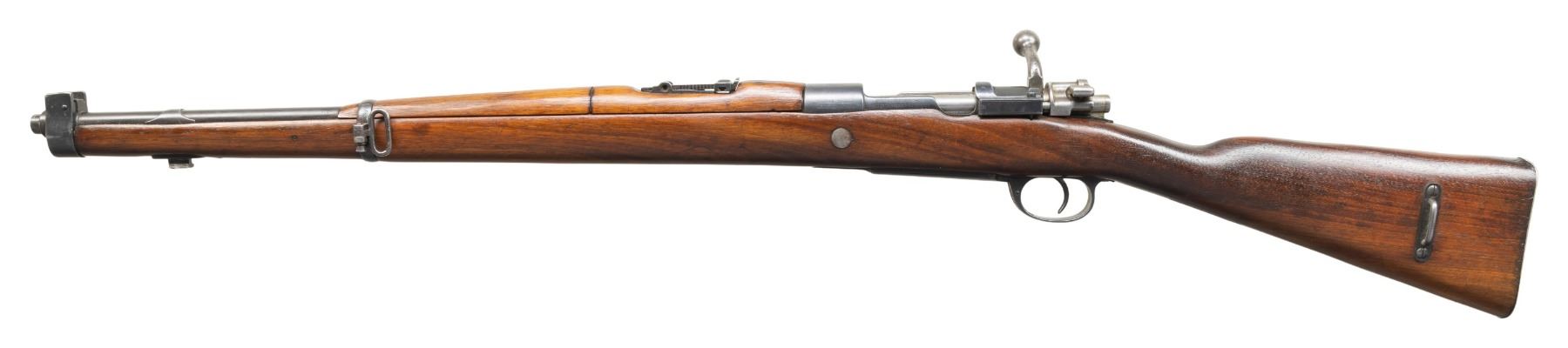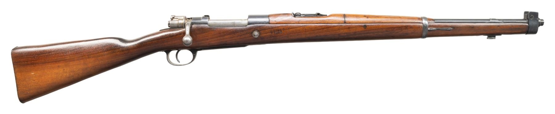 1) S# B7716. Standard Argentine 1909 carbine sights. Matching numbers on bolt & receiver. Other parts appear mismatched or unnumbered. Receiver ring has Argentine crest. Right rear of receiver has import marking. Left side of receiver has DWM markings. Receiver, bolt & buttplate are "In-the-white". Other parts showing varying shades of blue finish. Walnut stock set with left sling provisions & plugged bottom provisions. CONDITION: refinished stock shows a large armorer splice repair at toe, a couple small cracks, some chipping most notable on handguard, some scattered dings & handling marks. Receiver & bolt have been polished with light pitting, handling marks & oxidation. Balance of metal retains 95% reworked blue with some scattered blued over pitting, edge wear, oxidation, light dings & handling marks. Action functions properly when hand cycled. Bore shows scattered light pitting & frosting but strong rifling. (25-5328/MJC).