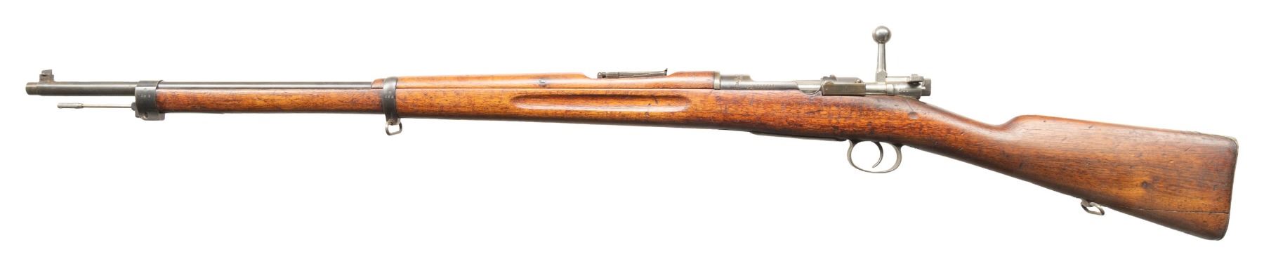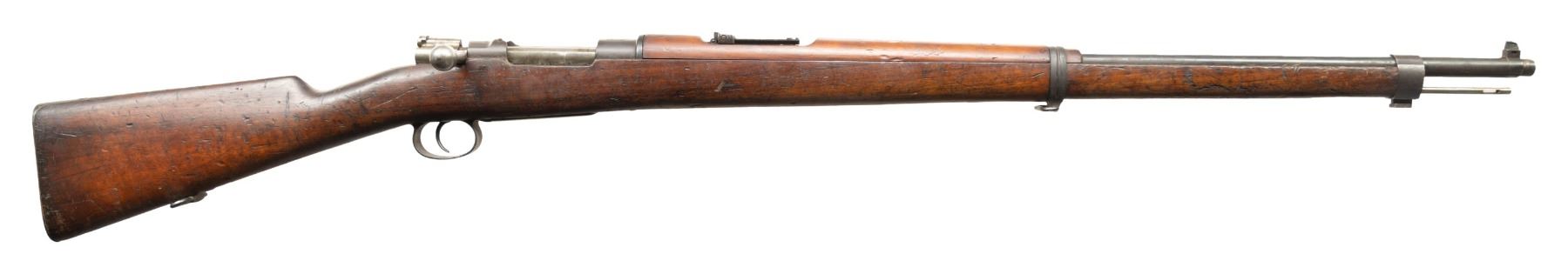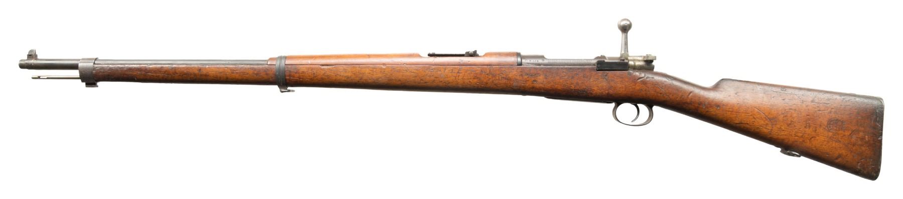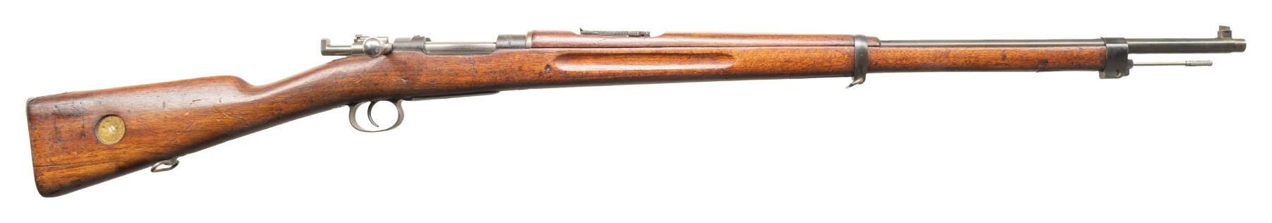 1) DWM CHILEAN 1895/61 MAUSER BOLT ACTION RIFLE. Cal. 308 Win. S# K566. Bbl. 29" with Century import marking. Blade front sight that is bent. Matching numbers on bolt parts. Other parts mismatched. Receiver ring has Chilean crest. Left side of reciever has DWM & Chileano markings. Rear of receiver has "7.62 N" marking denoting arsenal upgrade to 7.62 NATO. Arsenal rework blued finish. Walnut stock set with bottom mounted sling swivels. Left side of stock has strong Chilean 1895 dated cartouche. Cleaning rod present. CONDITION: stock set shows a few chips, scattered dings, abrasions, staining & handling wear. Metal is turning gray with strong arsenal blue along the exposed edges, floorplate appears to be a plum color, some light oxidation, dried cosmoline, edge wear & handling marks. Action functions properly when hand cycled. Very good bore with strong rifling. (25-5840/MJC).