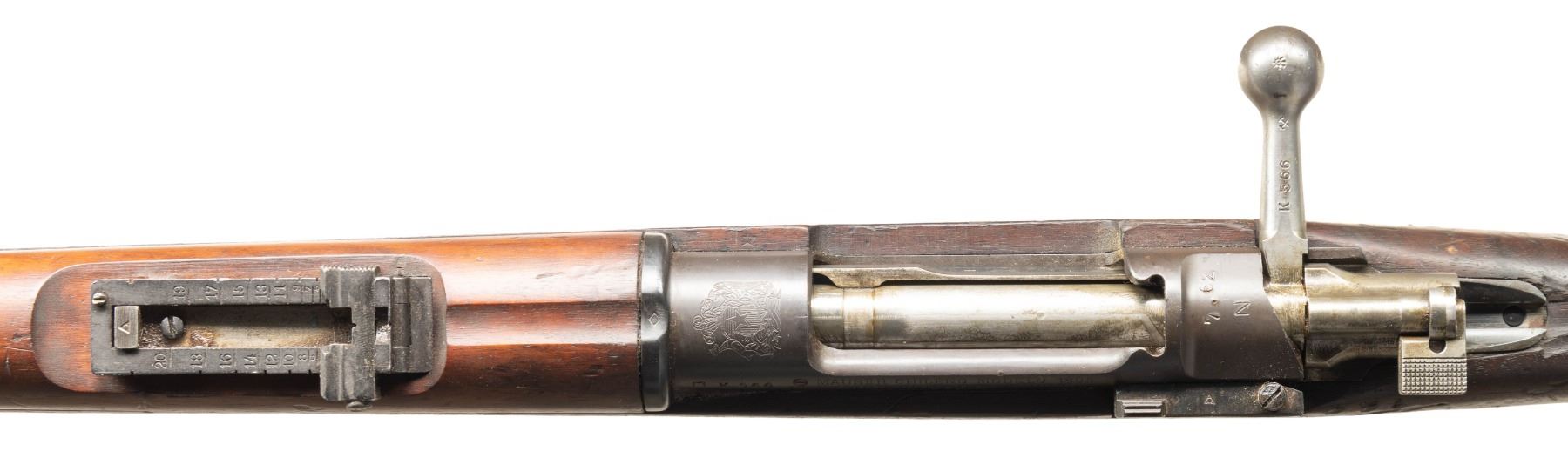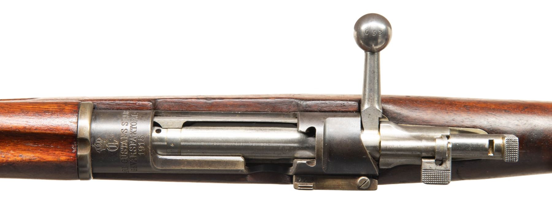2) SWEDISH M96 MAUSER BOLT ACTION RIFLE. Cal. 6.5x55. S# 355053. Bbl. 29" with Century import marking. Standard Swedish M96 sights. Cleaning rod is mismatched but other visible parts are matching with floorplate being crudely renumbered to match in modern font. Receiver ring has Carl Gustafs marking with 1915 date. Arsenal blue finish. Hardwood stock set with bottom mounted sling swivels. Cleaning rod present. Bore has a "2" over triangle for bore condition. Right side of butt also has 4 vacant screw holes from where a data plate once was. Underside of wrist has strong crown inspection stamp. CONDITION: stock set appears lightly sanded with 5" cracks on both sides of butt, a small tang crack, scattered dings, handling marks & scratches. Metal is turning gray with strong traces of arsenal blue finish, edge wear, dings, oxidation more heavy on buttplate & handling marks. Action functions properly when hand cycled. Action functions properly when hand cycled. Very good bore with some light frosting but strong rifling. (25-5987/MJC) PROVENANCE: From the PMRB Collection. BOTH CURIO. $600-1,000 for pair.