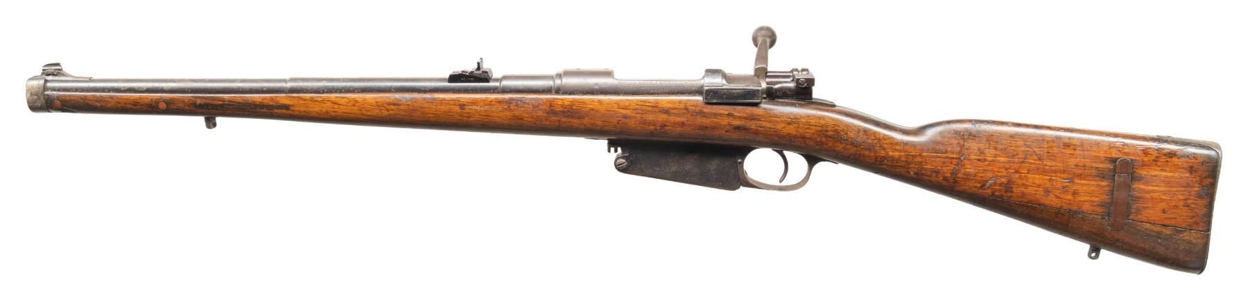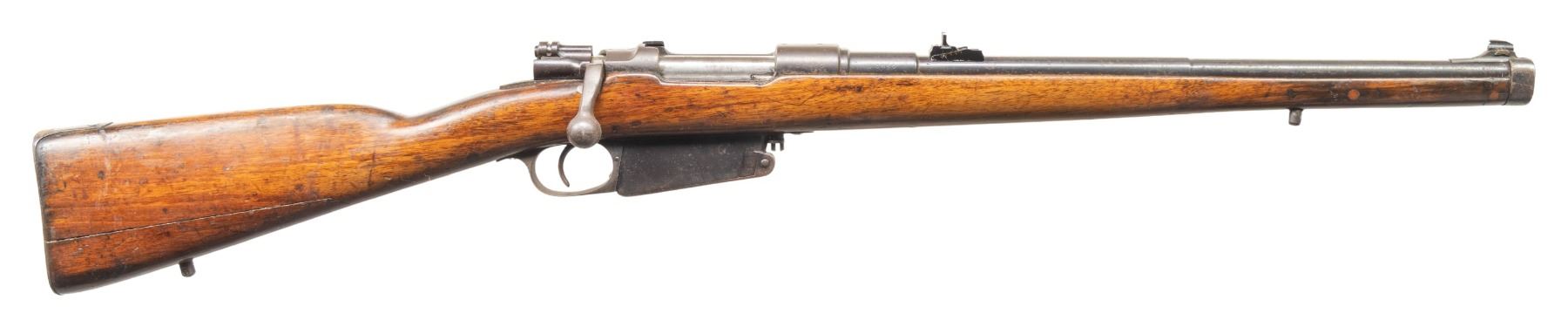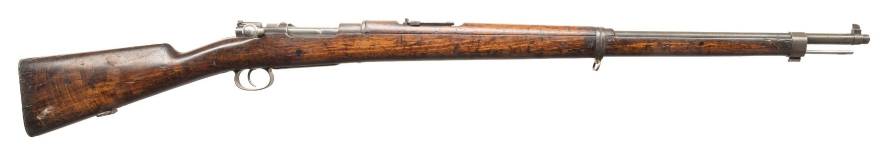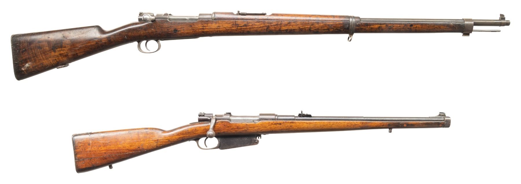 2) DWM Argentine 1891 Bolt Action Carbine. Cal. 7.65. Arg. S# C0886. Bbl. 18". Aftermarket bead front sight. Williams rear sight. Receiver is drilled & tapped for scope mounting. Matching numbers on receiver & bbl. Other parts are unnumbered or mismatched. Receiver ring has faint Argentine crest. Bolt handle has been altered. Blued finish. Walnut stock set with aftermarket bottom mounted sling studs. No handguard present. CONDITION: refinished stock has added finish, a large armorer repair at toe, some other plug repairs, a crack behind upper tang, some chipping, small cracks, scattered dings, handling marks & scratches. Metal shows a fading old reblue with scattered oxidation more heavy in some areas, edge wear, handling marks & dings. Action functions properly when hand cycled. Bore shows scattered frosting & oxidation but good rifling. (25-5355/MJC). BOTH CURIO. $600-900 for pair.