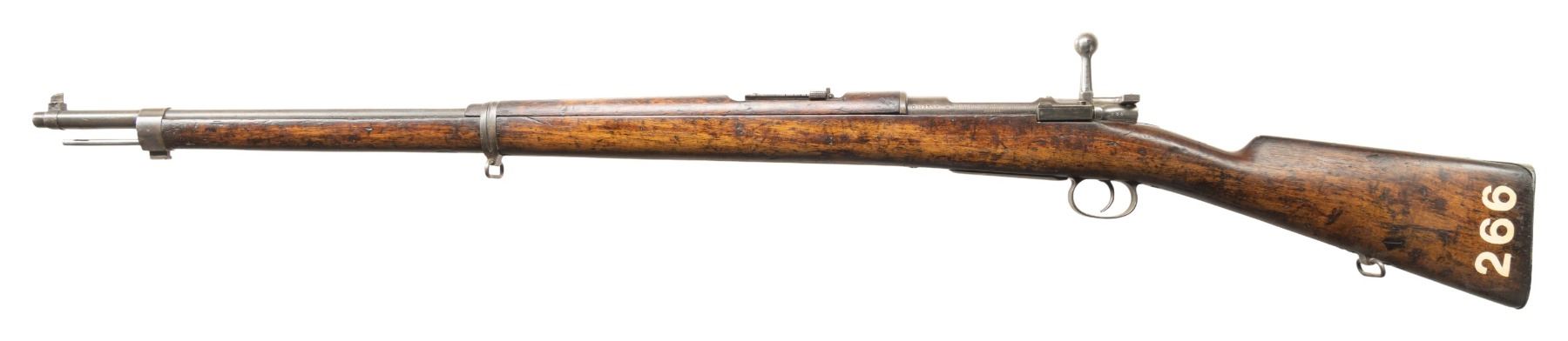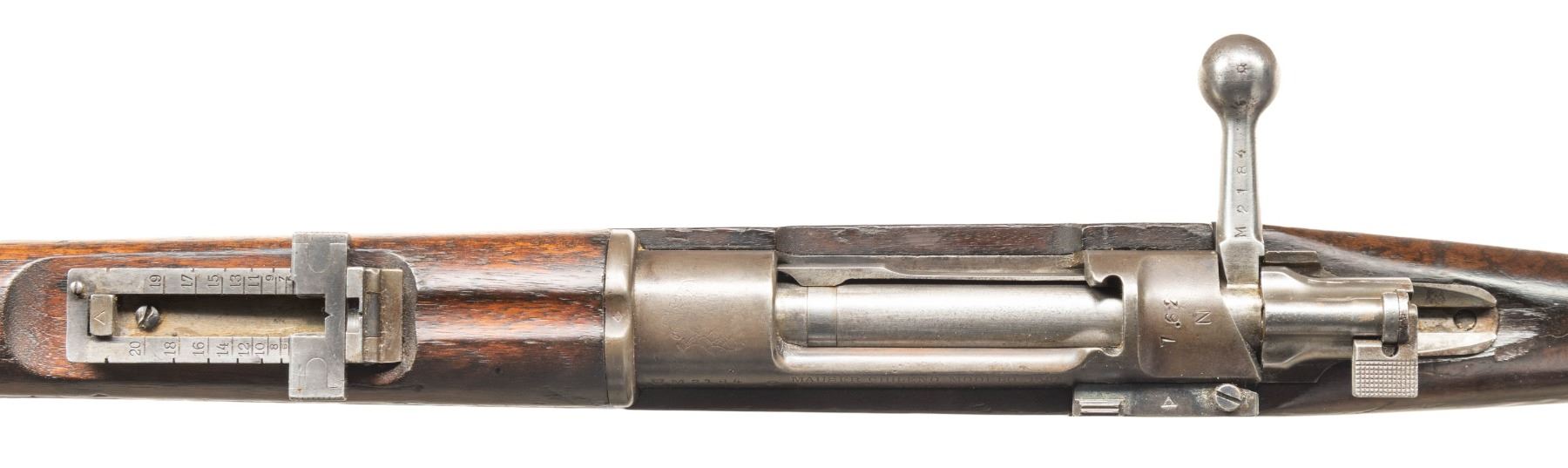 1) DWM 1895 Chilean Mauser Rifle. Cal. 7.62 NATO. S# M2184. Bbl. 29" with Century import marking. Standard Chilean 1895 sights. Stock has no discernable number & rear sight parts are mismatched but other visible parts are matching to receiver. Receiver has faint Chilean crest. Rear of receiver has "7.62 N" conversion marking. Left side of receiver has DWM & Chileano markings. Blued finish. Walnut stock set with white paint rack number on left side of butt & bottom mounted sling swivels. Matching numbered cleaning rod present. CONDITION: refinished stock set has added finish with scattered dings, chipping, handling marks, scratches & staining. Metal is mostly a gray color with scattered oxidation, traces of bluing, dings, pitting & handling marks. Action functions properly when hand cycled. Bore has strong rifling but some scattered pitting & dried grease. (25-5345/MJC).