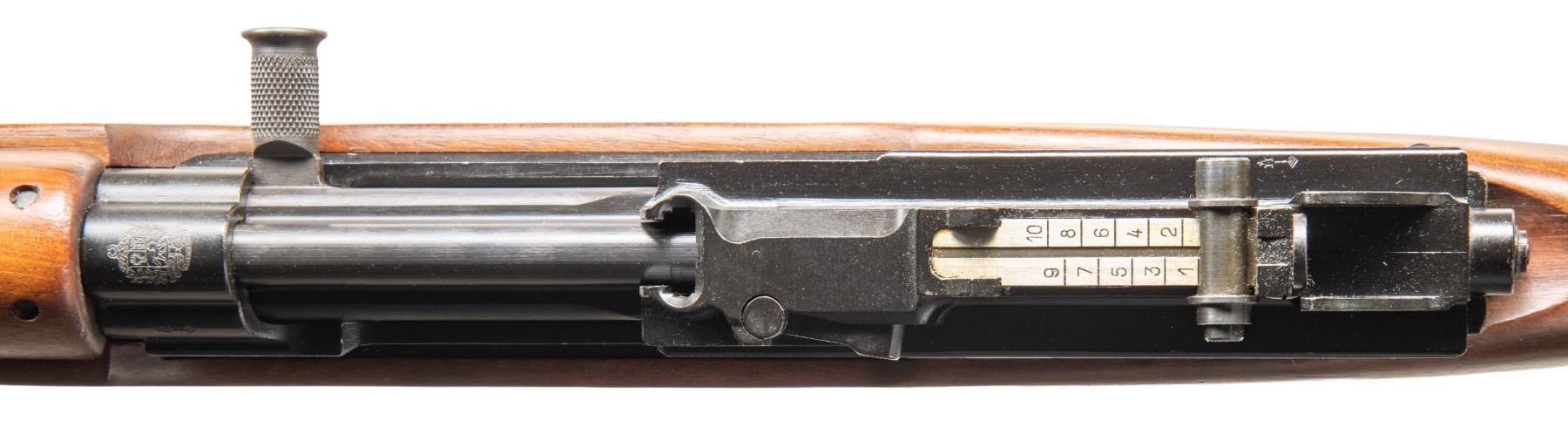 Cal. 7mm Mauser. S# 4073. Bbl. 24 1/2" with muzzle brake. Blade front sight with protective ears. Aperture rear sight graduated to 1000m. Matching numbers on receiver & rear right of action. Receiver has Venezuelan crest. Black enamel finish. Walnut stock set with crisp Venezuelan cartouche & bottom mounted sling swivels. CONDITION: stock shows some light handling marks. Metal retains 97% original black enamel with some light flaking on exposed edges & handling marks. Action functions properly when hand cycled. Bright near excellent bore. (25-6868/MJC). CURIO. $1,000-1,500.