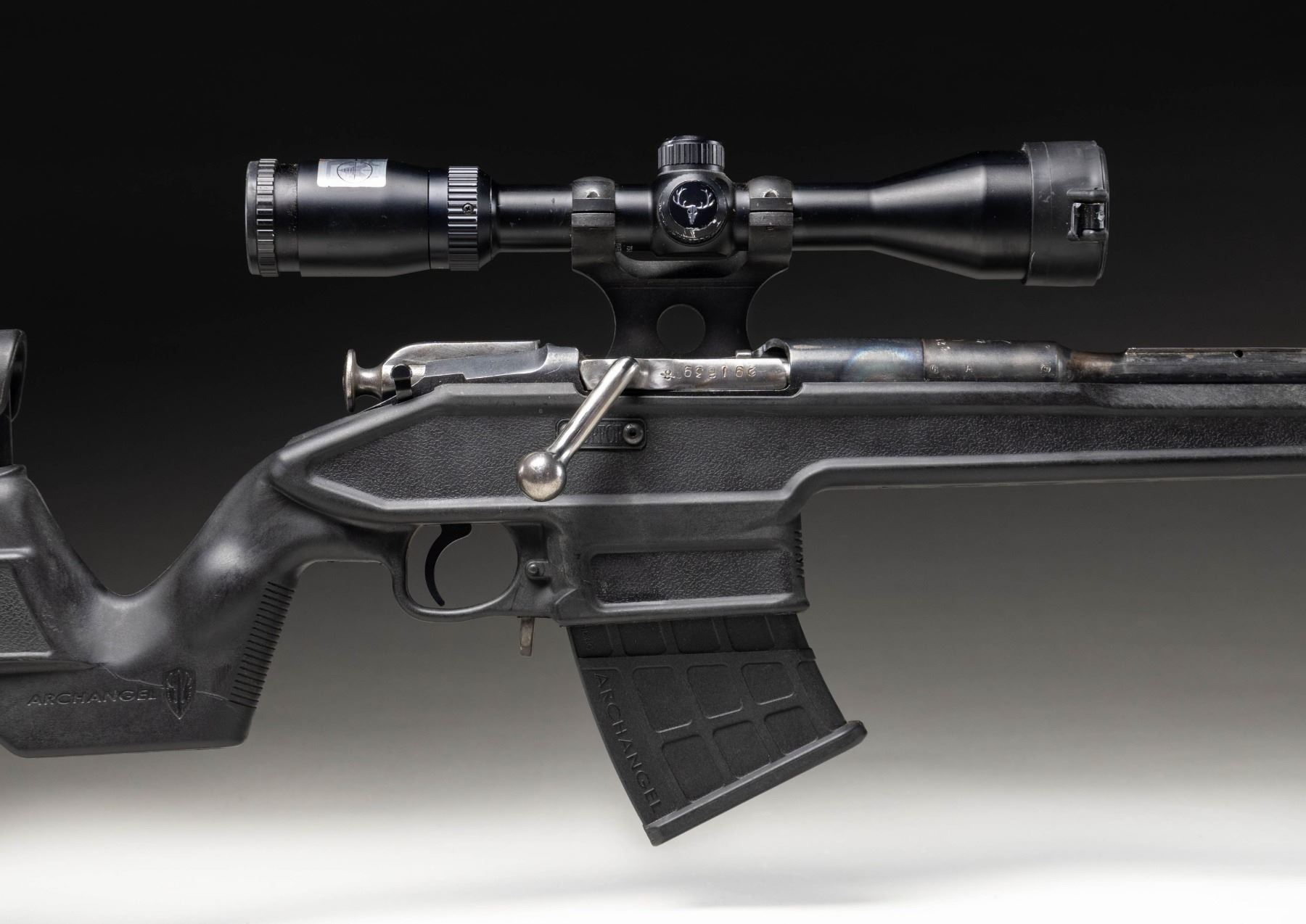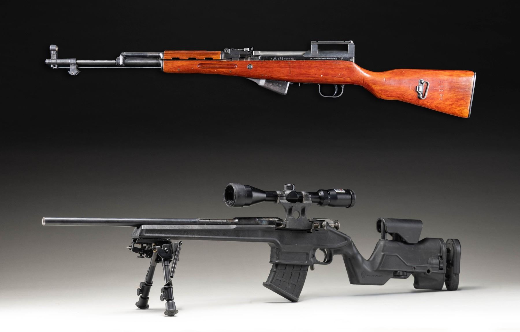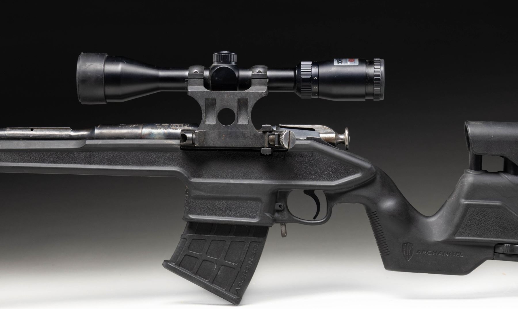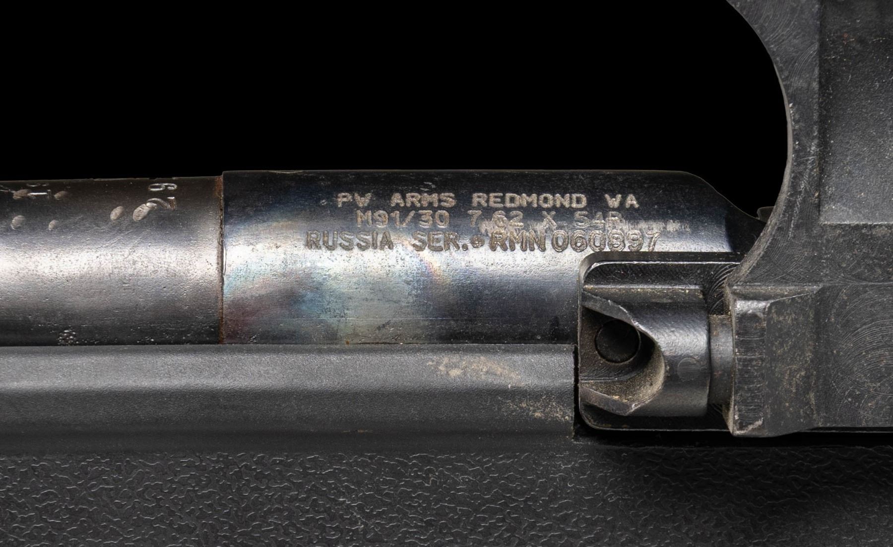 2) Modified Tula 91/30 Mosin Nagant Bolt Action Rifle. Cal. 7.62x54R. S# RMN060897. Bbl.19" shortened. Rifle lacks iron sights but is equipped with a side mounted Bushnell 3-9x power DOA scope. Scope has crosshair reticle with BDC, scope covers with front cover missing lens. Matching numbers on bbl. & bolt. 1937 Tula 91/30 converted to a more modern config. Left side of receiver has PW Arms import marking with importer added serial number. Turned down bolt handle. Blued finish. Archangel stock with added manual safety & folding bipod. MAGS: 1-10 rd. detachable. CONDITION: stock shows scattered scuffs & handling marks. Metal shows some touch up finish on receiver, scattered light dings, oxidation & edge wear. Action functions properly when hand cycled. Fair bore with frosting along its length but good rifling. (25-5480/MJC). BOTH MODERN. $500-800 for pair.