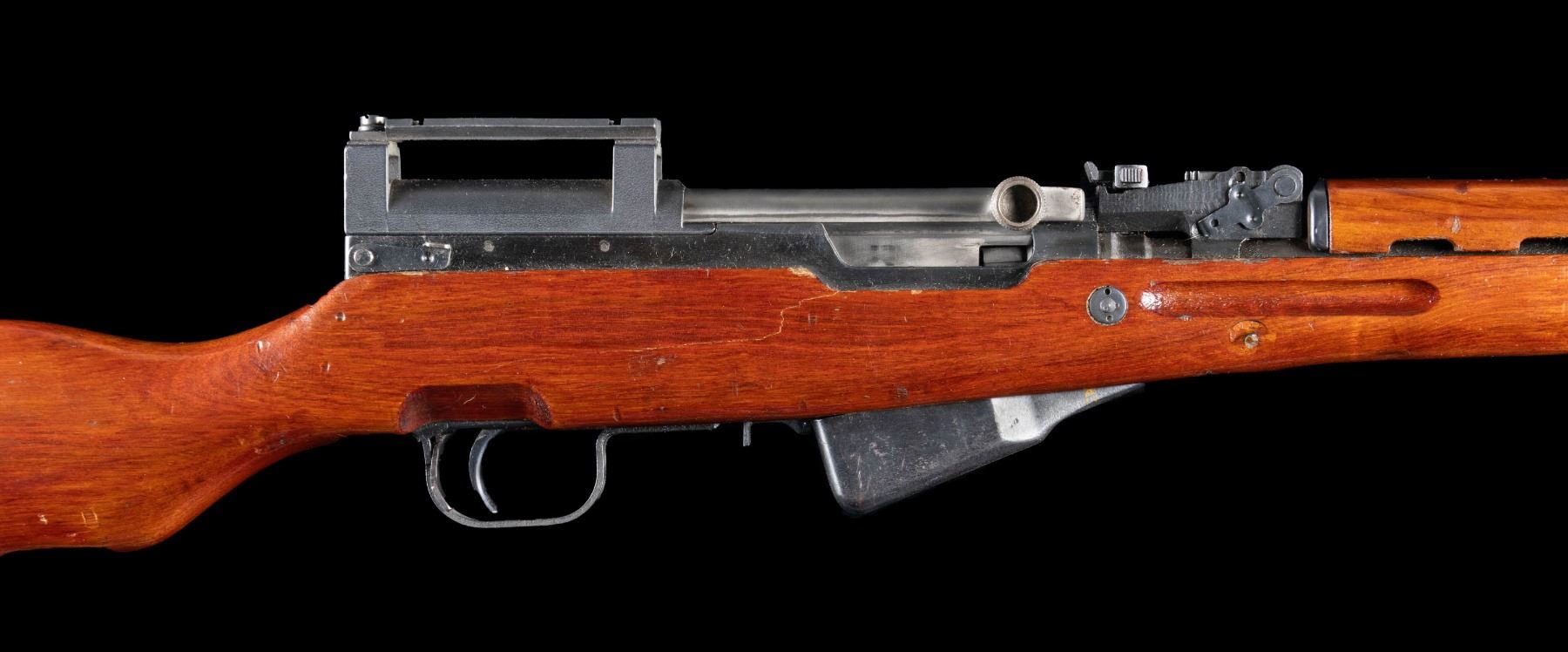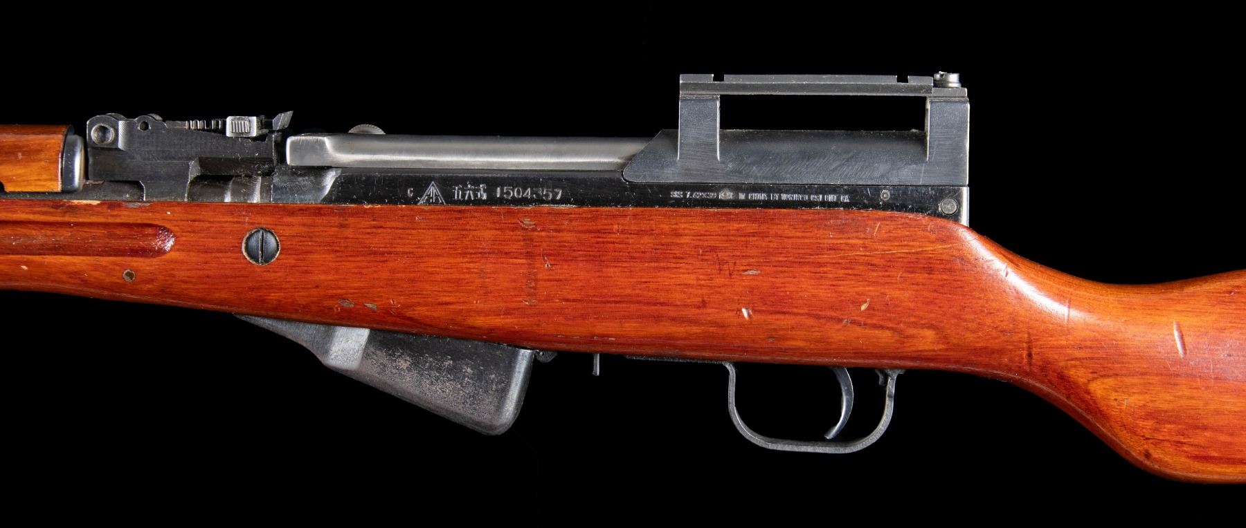 1) Norinco SKS Semi Auto Rifle. Cal. 7.62x39. S# 1504357. Bbl. 20 1/2". Standard SKS style sights. Aftermarket Weaver style top cover scope mount. Aside from top cover other numbers are matching to receiver. Left of receiver has Triangle 26 arsenal & Norinco import markings. Blued finish. No bayonet assembly present. Asian hardwood stock set with left side sling provisions. Cleaning rod present. CONDITION: stock set shows a 5" zig-zag crack on right side of action, scattered handling marks & dings. Metal retains 80% blue with scattered oxidation more heavy on mag assembly, edge wear & handling marks. Action functions properly when hand cycled. Bright near excellent bore. (25-5321/MJC).