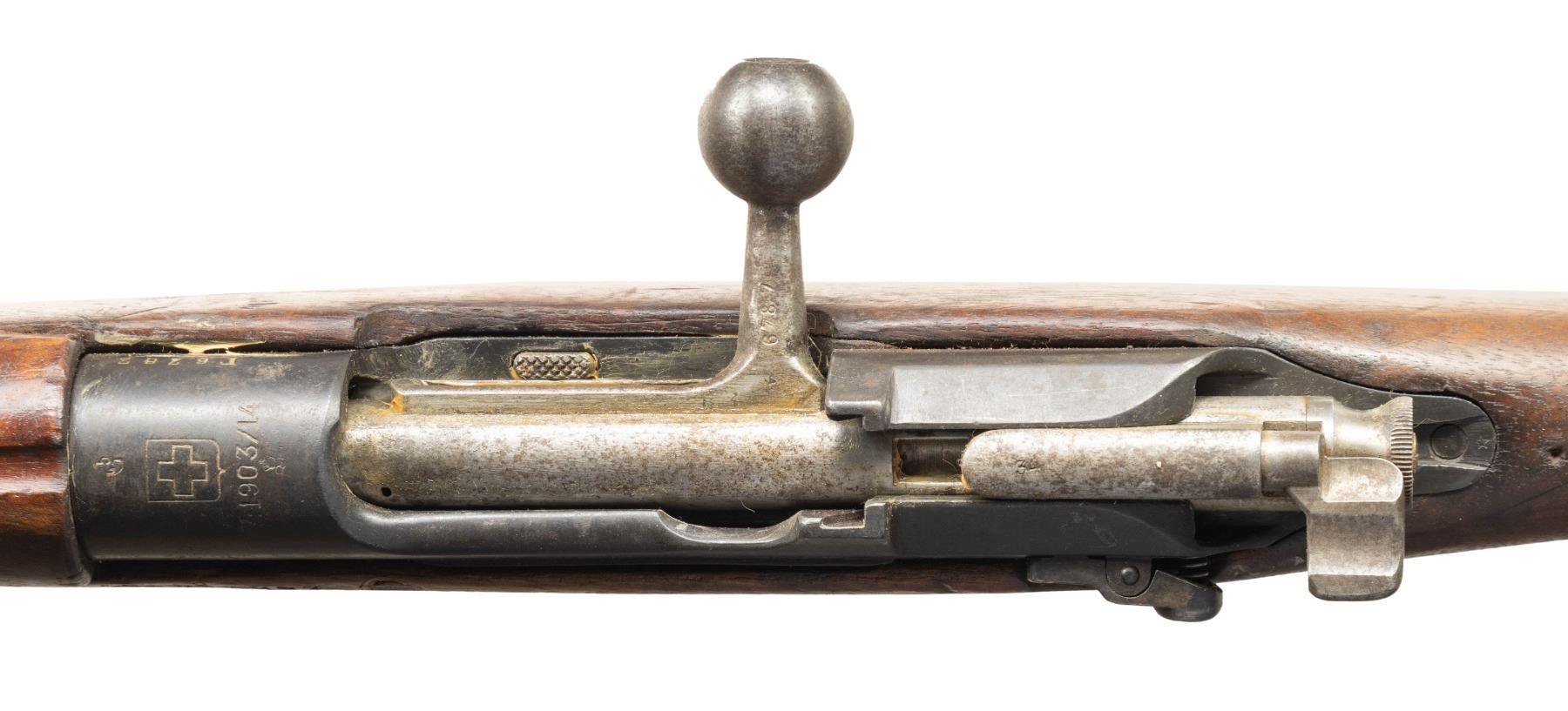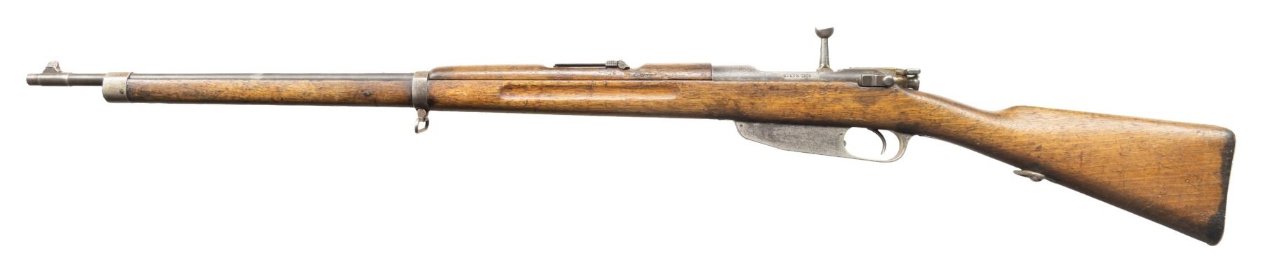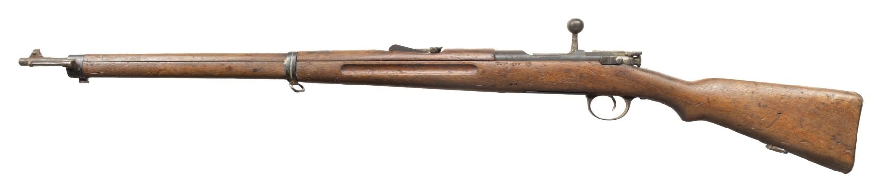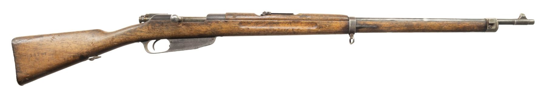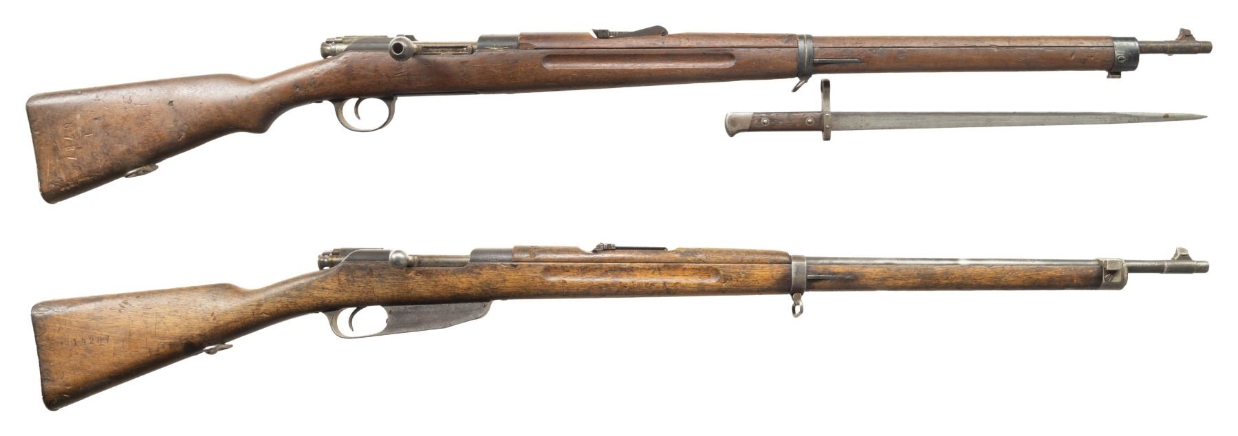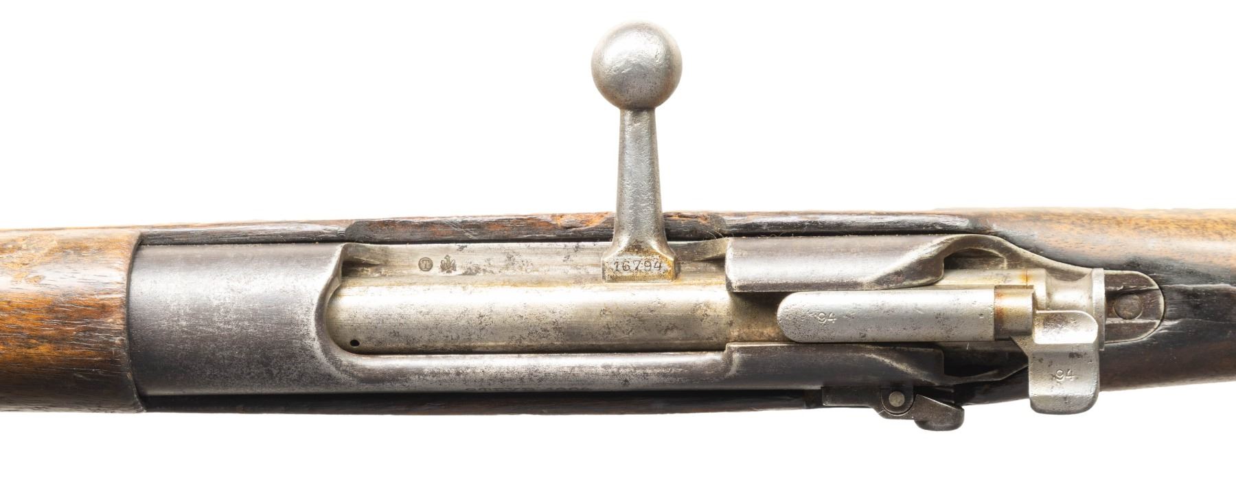 2) Steyr 1904 Mannlicher Rifle. Cal. 8mm Mauser. S# 16794. Bbl. 28 3/4". Blade front sight. Ladder rear sight. Matching numbers on receiver & bolt parts. Stock is mismatched. Export turn-bolt Mannlicher rifle that feeds from Gew 88 clips & similar to the Romanian 1893 model. The Irish Ulster Volunteer Force notably used this model rifle but this example lacks any overt UVF traits. Left side of receiver marked "STEYR 1904". Hardwood stock with bottom mounted sling swivels. No cleaning rod or rear sling plate screw present. Right side of butt has faint old added letters. CONDITION: stock set appears to have been lightly sanded long ago with a plug repair behind upper tang, a couple notable glue handguard repairs around rear sight, a few chips, a few gouges, scattered staining, dings, scratches & handling marks. Metal has a silvery-gray appearance with scattered pitting, oxidation, edge wear & handling marks. Action functions properly when hand cycled. Dark poor pitted bore with heavily worn rifling. PROVENANCE: From the PMRB Collection. (25-5849/MJC). BOTH CURIO. $600-1000 for lot.