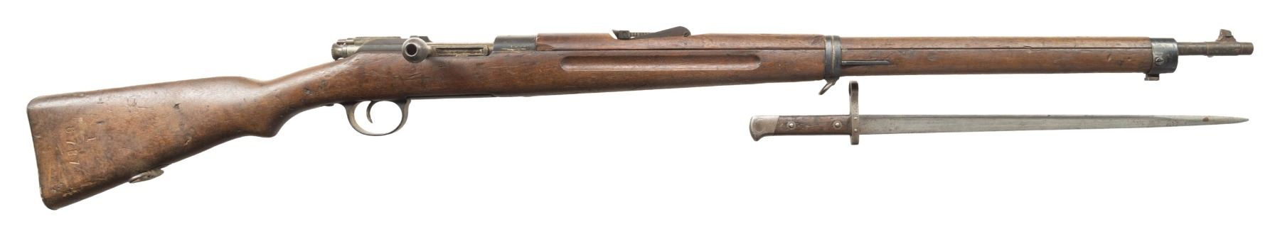 1) Greek 1903/14 Bolt Action Rifle. Cal. 6.5 MS. S# R6787. Bbl. 29". Blade front sight. Tangent rear sight graduated to 2000m. Stock appears arsenal force matched to receiver on both left side of action & right side of butt. Bolt appears unnumbered. Breda made 1903/14 Mannlicher Schoenauer rifle dated 1927. Receiver ring has Greek cross & "1903/14" model designation. Arsenal rework blued finish. Hardwood stock set with bottom mounted sling swivels. Left side of butt has faint outline of Greek roundel. No cleaning rod present. UNATTACHED ACCESSORIES: Steyr made bayonet without scabbard. CONDITION: stock set has arsenal rework appearance with a notable chip at rear right of handguard, some other light chips, scattered dings, light gouges & handling marks. Metal retains 40% arsenal rework blue with scattered oxidation more heavy on the front end & bolt assembly, some dried grease, scatted handling marks & fading. Action functions properly when hand cycled. Dark bore with oxidation & some pitting but evident rifling. (25-5836/MJC).