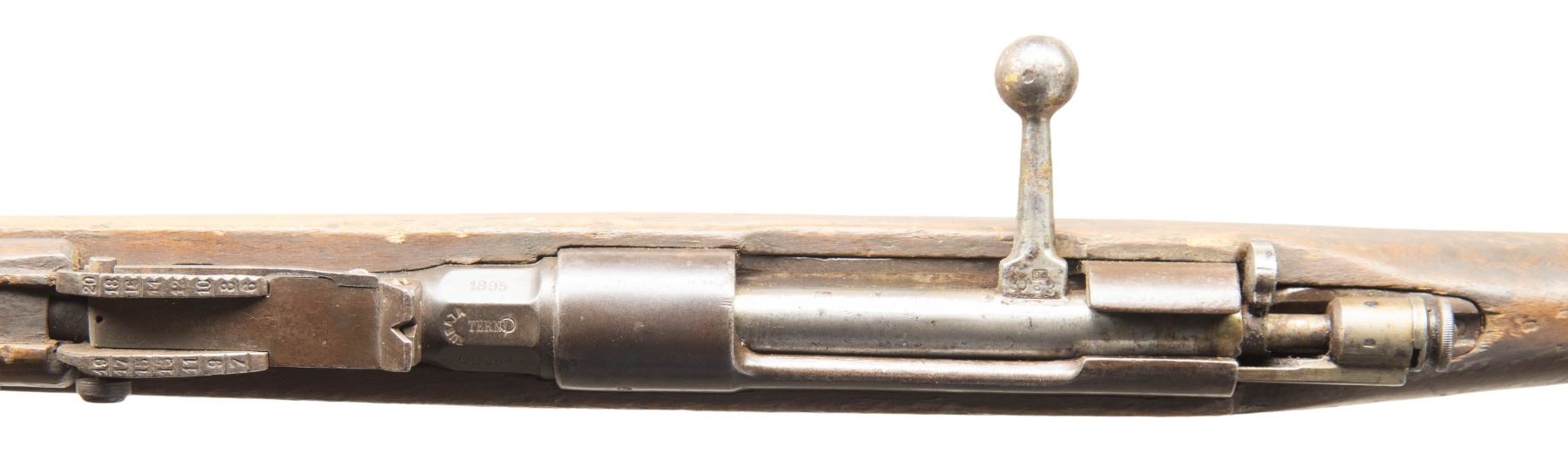 1) Dutch 1895 Mannlicher Bolt Action Rifle. Cal. 6.5 Dutch. S# 2361H. Bbl. 31 1/2". Blade front sight. Tangent rear sight graduated to 200m. Bolt parts, front band & bottom metal are all matching to receiver. Other visible parts are mismatched. 1897 dated & Steyr made Dutch M95 Mannlicher. Arsenal blue finish. Hardwood stock set that appears WW2 German modified with K98k style sling arrangement, plugged bottom slot & repro sling. Right side of butt has strong 1897 dated cartouche & faint added white numbers at rear. No cleaning rod present. CONDITION: stock set has a darkened appearance with a 3" crack behind upper tang, several gouges, some chipping in ramrod channel, scattered dings, abrasions, scratches & handling wear. Metal is turning gray with oxidation more heavy on front end, scattered edge wear & handling marks. Action functions properly when hand cycled. Bore has strong rifling but scattered pitting & oxidation. (01-28426/MJC).
