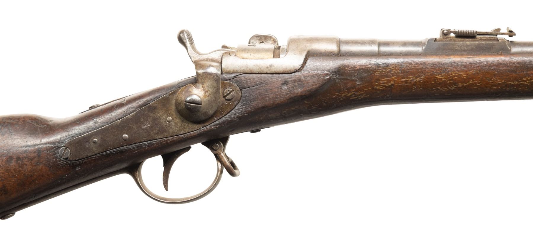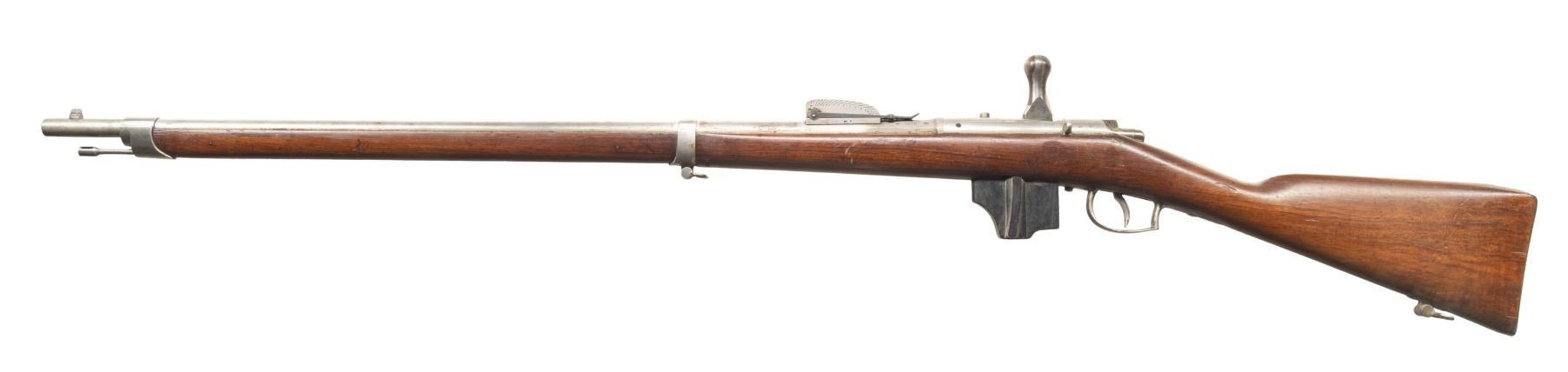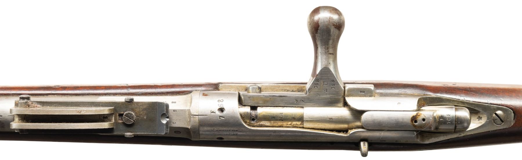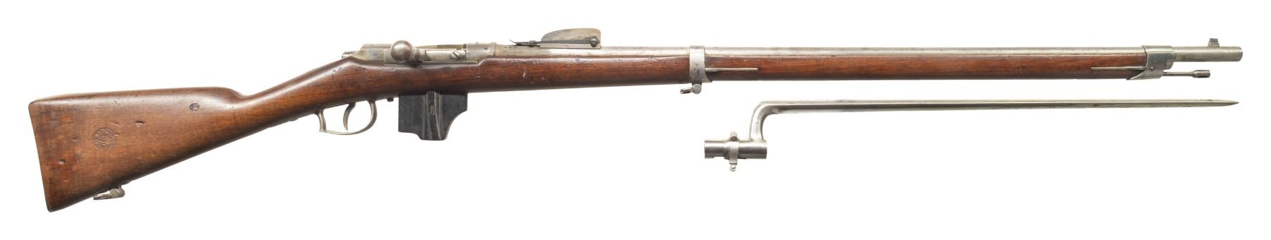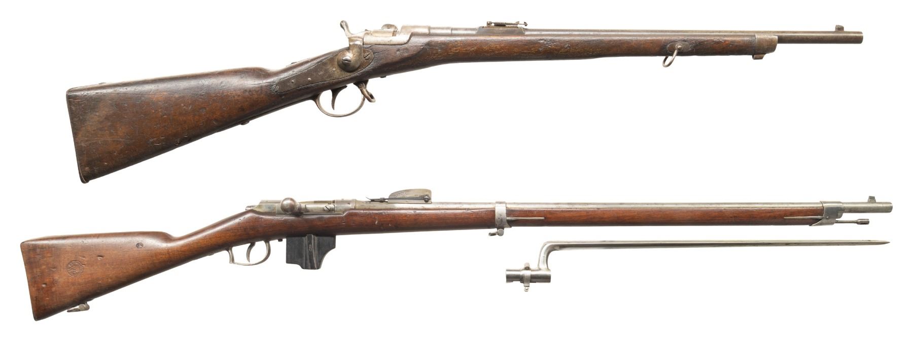 2) Beaumont 1871/88 Bolt Action Rifle. Cal. 11mm Beaumont. S# 768. Bbl. 32". Blade front sight. Tangent rear sight graduated to 1800m. Matching numbers on bolt & receiver. Other visible parts appear unnumbered. Beaumont updated to Vitali mag. Receiver has faint Maastricht marking. Bbl. has 1876 date. Balance of metal parts are bright with mag being blued. Hardwood stock set with bottom mounted sling swivels. Right side of butt has strong 1876 dated acceptance cartouche. Replacement ramrod present. UNATTACHED ACCESSORIES: second pattern 1871 Beaumont bayonet that appears cleaned & shows light oxidation. CONDITION: stock has arsenal rework type finish with a few shallow gouges, scattered dings, scratches & handling marks. Metal has been notably cleaned to bright with some flaking on mag body & scattered oxidation. Action is full of grease but appears functional when hand cycled. Bright very good plus bore showing perhaps some minor frosting. PROVENANCE: From the PMRB Collection. (01-28396/MJC). BOTH ANTIQUE. $800-1,200 for lot.