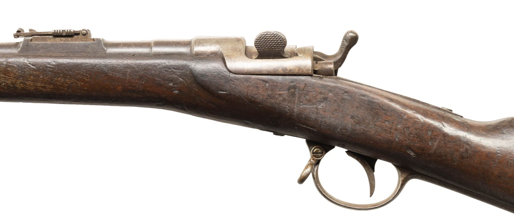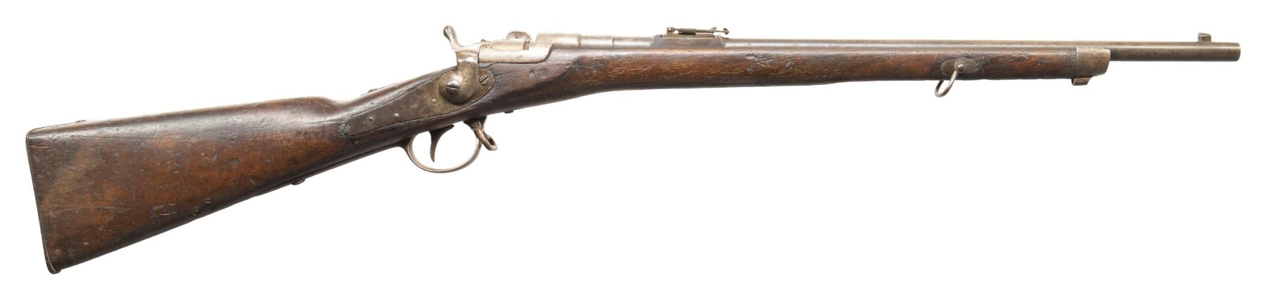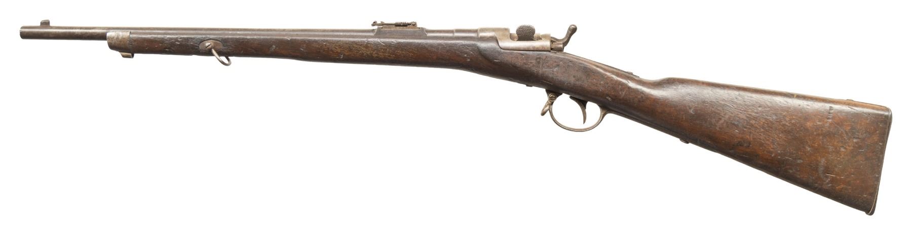 1) Werndl 1867 Single Shot Carbine. Cal. 11mm Werndl. NSN. Bbl. 23 1/3". Blade front sight. Ladder rear sight with Schritt graduations. Lock has 1868 date. Top of action has "FERD FRUUWIRTH" marking. Buttplate tang has "6.T.D./2191." unit marking. Hardwood stock set with bottom mounted sling swivels. No ramrod present. CONDITION: stock has older added finish with a 2" crack on left side of action, a couple smaller cracks ahead of lock, scattered dings, chips, handling marks, gouges & scratches. Metal is mostly a gray patina with overall oxidation, scattered pitting more heavy on upper tang, handling marks & edge wear. Action functions properly when hand cycled. Bore is mostly bright with a couple small spots of light pitting but strong rifling. (01-28392/MJC).