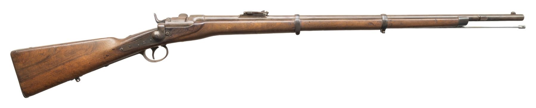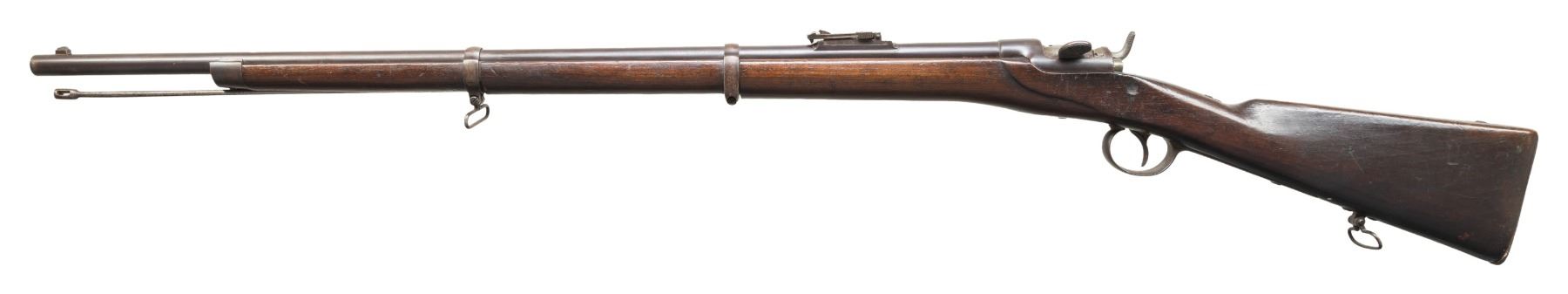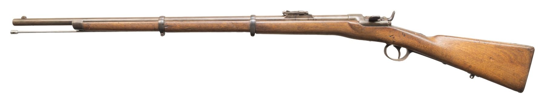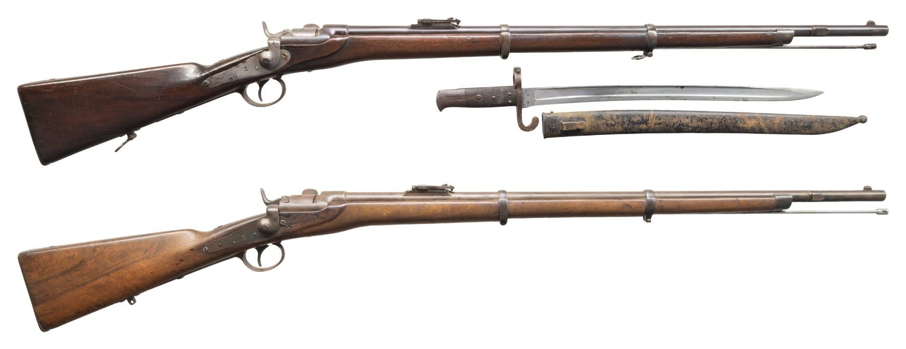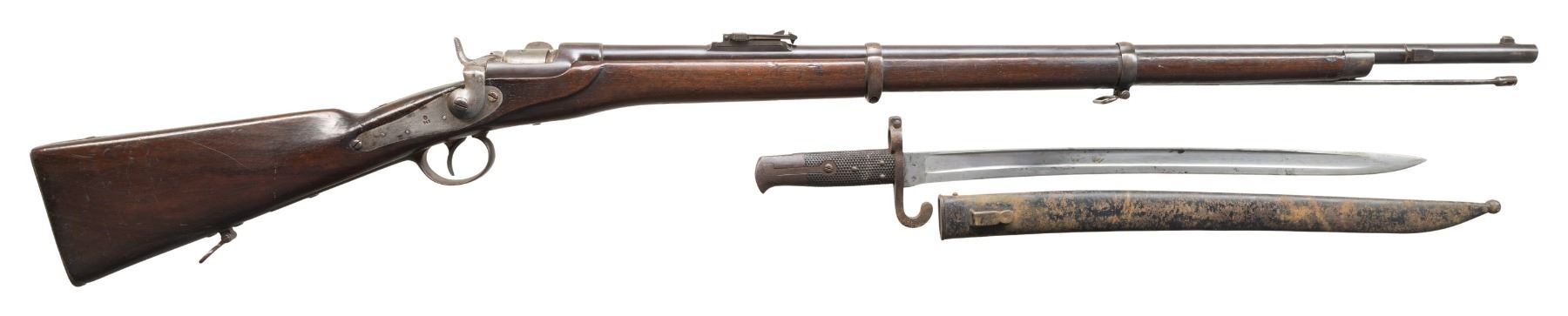 1) Werndl 1867 Rifle. NSN. Bbl. 33". Blade front sight. Ladder rear sight graduated to 1400 Schritt. Lock has 1868 date. Rear of bbl. marked "st69". Receiver marked "WERNDL". Tang of buttplate has "29.R.E.B./1.158" unit marking. Arsenal blued finish. Hardwood stock set with bottom mounted sling swivels. Ramrod present that maybe replaced. UNATTACHED ACCESSORIES: M1870 sword bayonet with bayonet. CONDITION: stock set has added finish with a notable gouge on left side of action, a few small chips, scattered dings, handling marks & scratches. Bbl. retains strong arsenal blue with scattered oxidation, handling marks & edge wear. Balance of other parts are a gray patina with edge wear, oxidation & dings. Action functions properly when hand cycled. Very good bore with some light pitting. (01-28393/MJC).