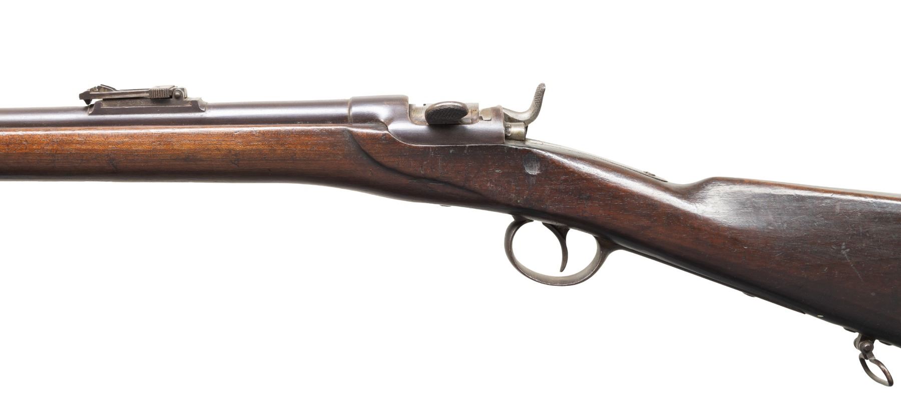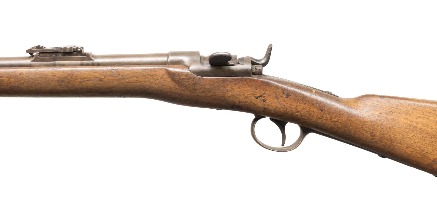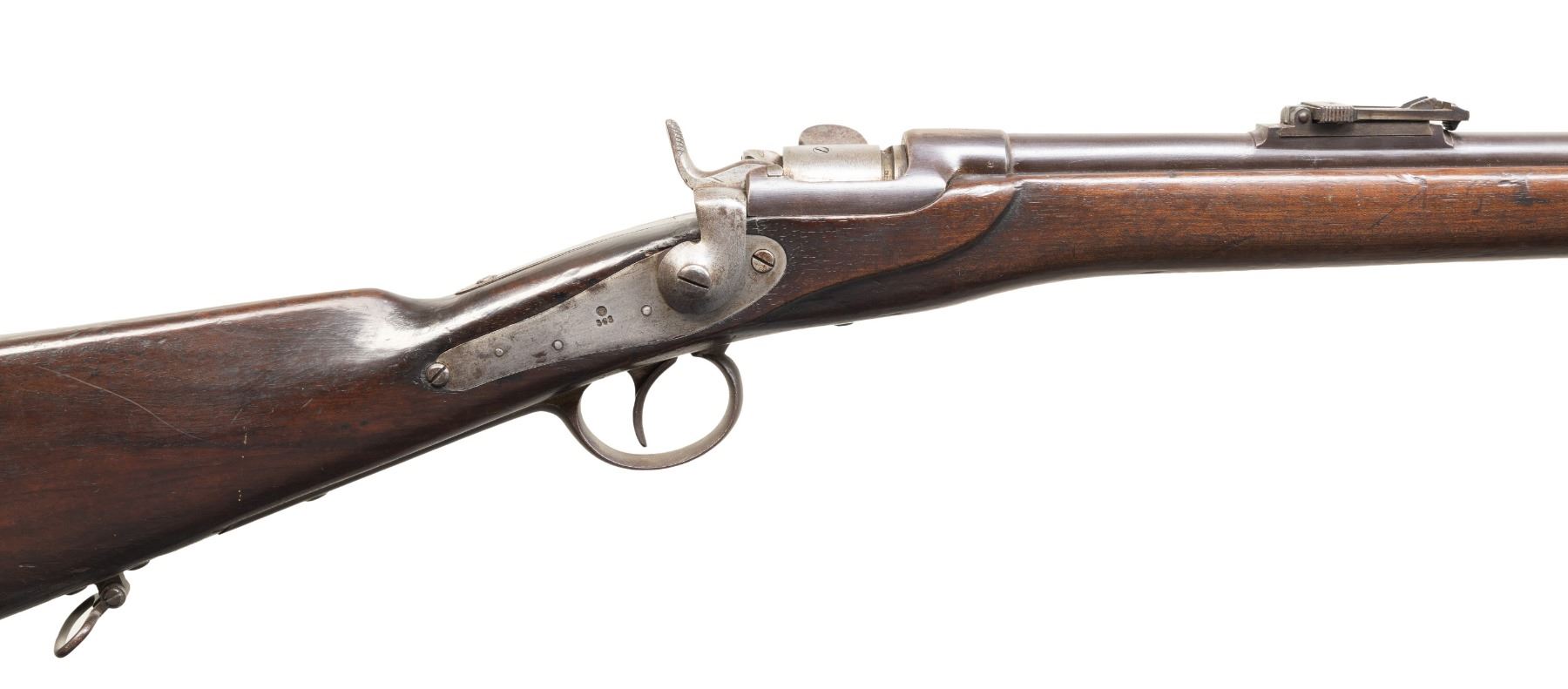 1) Werndl 1867 Rifle. NSN. Bbl. 33". Blade front sight. Ladder rear sight graduated to 1400 Schritt. Lock has 1868 date. Rear of bbl. marked "st69". Receiver marked "WERNDL". Tang of buttplate has "29.R.E.B./1.158" unit marking. Arsenal blued finish. Hardwood stock set with bottom mounted sling swivels. Ramrod present that maybe replaced. UNATTACHED ACCESSORIES: M1870 sword bayonet with bayonet. CONDITION: stock set has added finish with a notable gouge on left side of action, a few small chips, scattered dings, handling marks & scratches. Bbl. retains strong arsenal blue with scattered oxidation, handling marks & edge wear. Balance of other parts are a gray patina with edge wear, oxidation & dings. Action functions properly when hand cycled. Very good bore with some light pitting. (01-28393/MJC).
