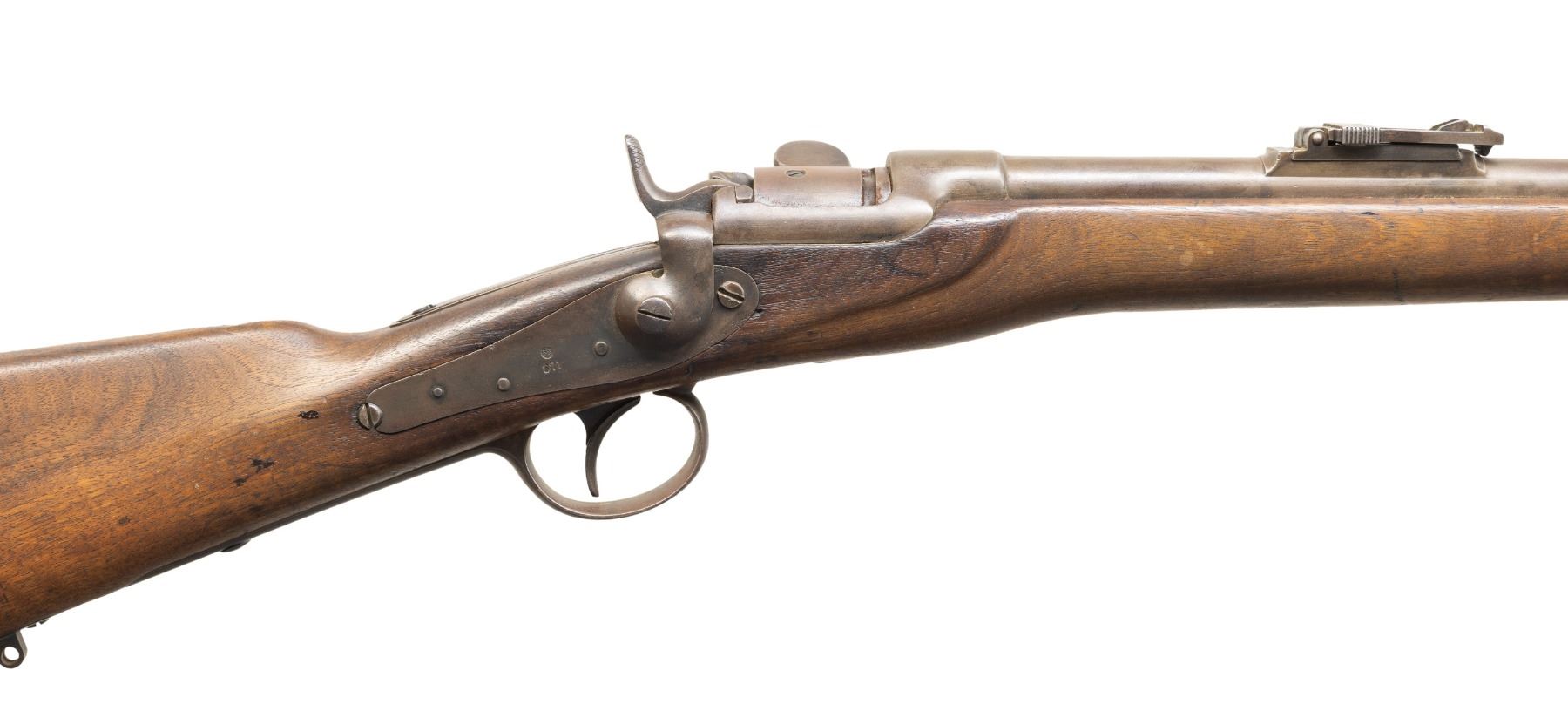 2) Werndl 1867 Rifle. NSN. Bbl. 33". Blade front sight. Ladder rear sight graduated to 1400 Schritt. Lock has 1871 date. Top of action marked "WERNDL". Tang of buttplate has " 57. LSTB/771/" unit marking. Hardwood stock set with bottom mounted sling hardware. Ramrod present that appears to be a later replacement. CONDITION: stock appears to have an old light sanding with some small cracks around cock, scattered dings, light chips & handling marks. Metal is a dull gray color possibly from faded old touch up with a few spots of light pitting, scattered oxidation, traces of bluing & handling marks. Action functions properly when hand cycled. Poor bore with several large patches of oxidation & pitting. PROVENANCE: From the PMRB Collection. (01-28394/MJC). BOTH ANTIQUE. $800-1,200 for pair.