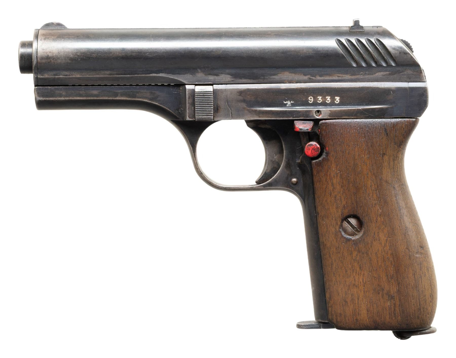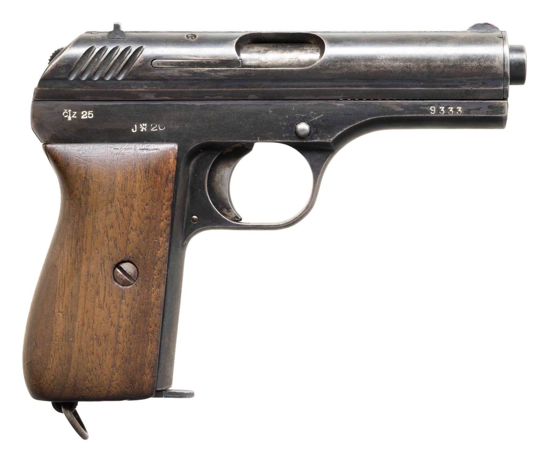 PISTOL. Cal. 380 ACP. S# 9333. Bbl. 3 1/2". CZ24 semi-automatic pistol mfg. in Czechoslovakia by CZ in 1925. The top of the bbl. is marked "CESKA ZBROJOVKA A.S.vPRAZE", followed by the S# and a Czech Rampant Lion proof, with a faint "25" marked on the left side. Right side of the frame is marked "C (ARROW) Z 25", followed by a Czech military "J (RAMPANT LION) 26" acceptance proof. Metal components exhibit what appears to be a period reapplied blue finish overall. Frame is mounted with a 1-piece plain wood wrap around grip. Fixed blade front sight, with dovetailed V-notch rear sight. Mag. release is fitted with a lanyard loop. Matching numbers are present on the frame and slide. Bbl. is mismatched (S# 167822). MAGS: 1 FN1922 8-rd. mag. CONDITION: metal components retain large amounts of their reapplied blue finish, exhibiting areas of wear and thinning that show through to gray and brown patinas overall, with some scattered superficial handling marks and spots of pitting. Bore is bright, exhibiting scattered spots and areas of dark moderate pitting, while retaining good rifling throughout. Although the wrong mag. is present, the mag. safety still functions properly with the mag. inserted. Grip shows some scattered marks and minor impressions from handling and storage, but otherwise remains sturdy and serviceable. (25-6713/MLW). CURIO. $200-400.