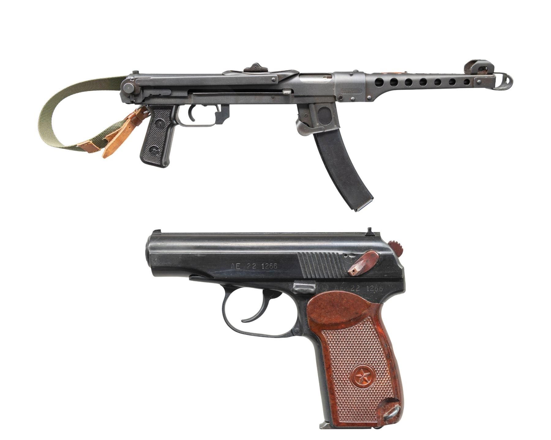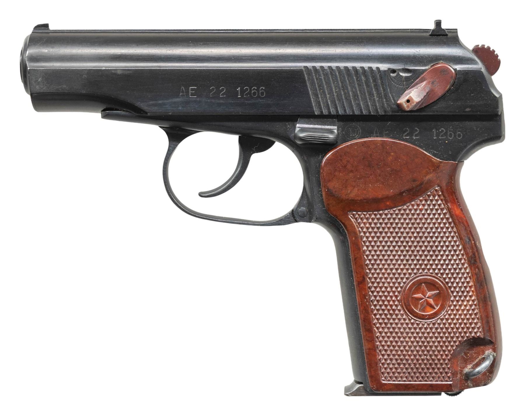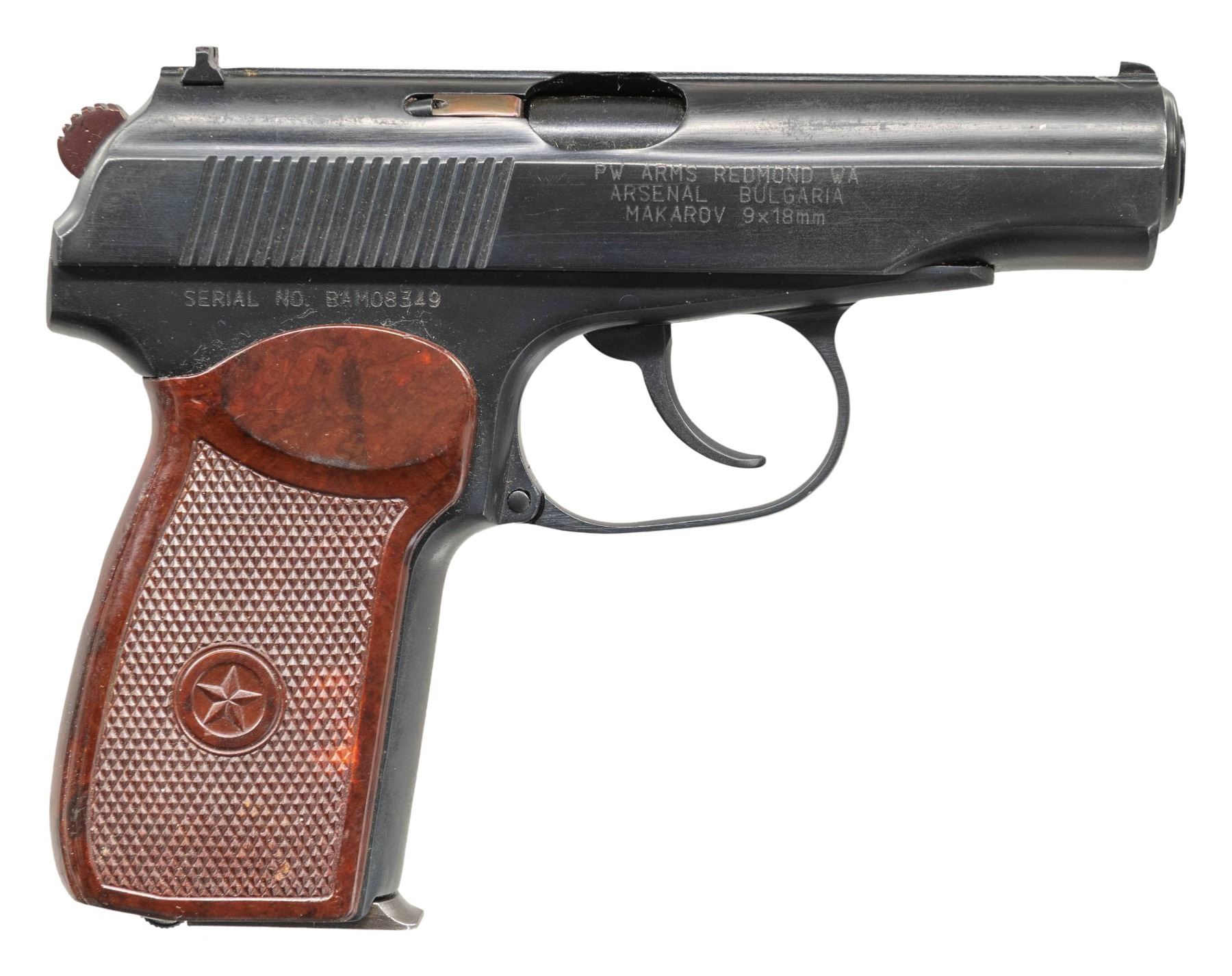 1) Bulgarian Makarov Pistol. Cal. 9x18 Mak. S# BAM08349. Bbl. 3 5/8". Standard Makarov sights. Matching numbers on slide & frame. Circle 10 made Makarov pistol. Right side of slide has PW Arms import marking. Right side of frame has importer added serial number. Arsenal blue finish. Checkered brown bakelite grips with Communist star monograms. MAGS: 1-8 rd. CONDITION: grips show some handling marks & wear. Metal 90% arsenal blue some handling marks, light edge wear, dried grease & some light oxidation on exposed edges. Action functions properly when hand cycled. Very good bore with strong rifling. (25-4670/MJC).