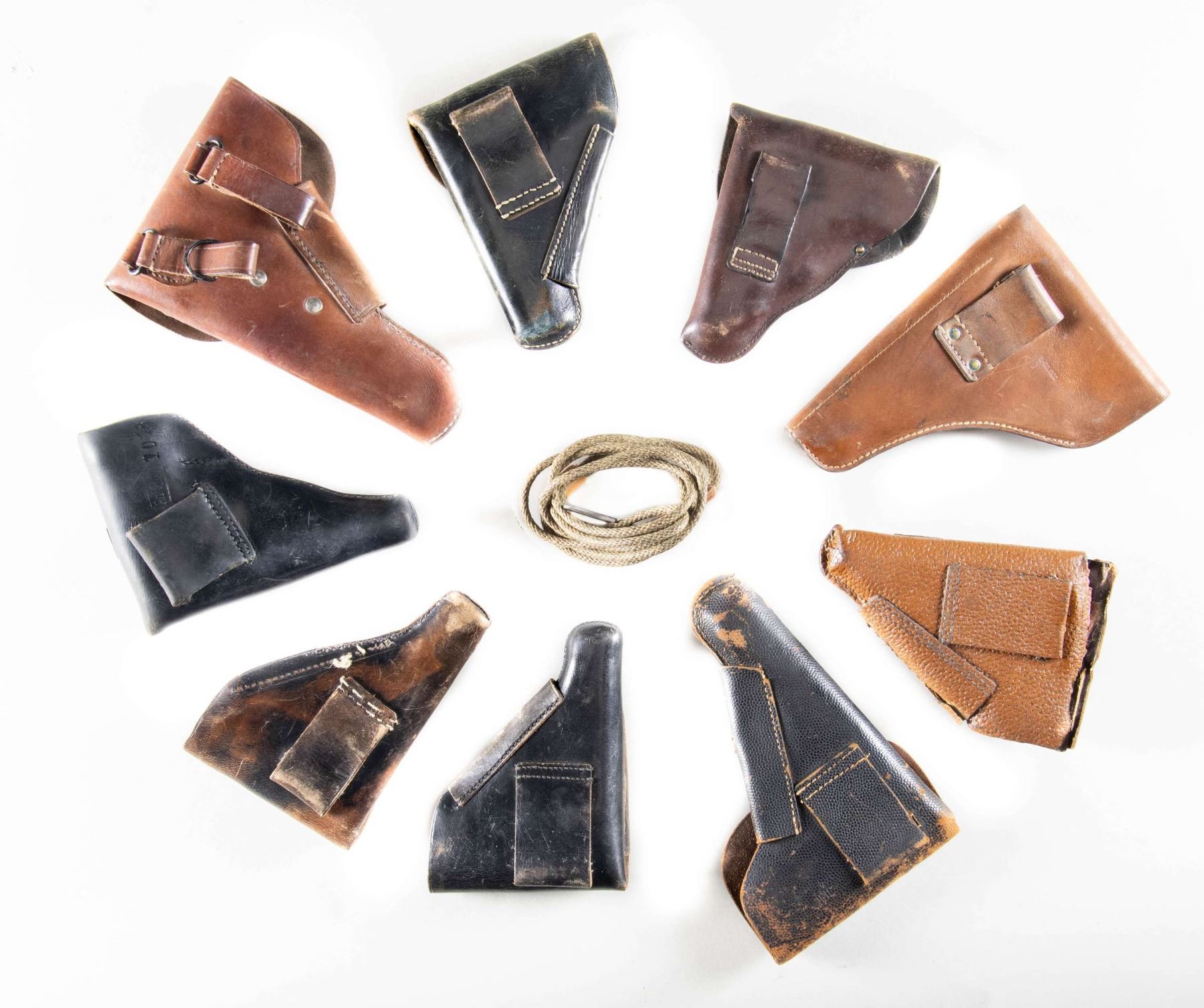 Lot of assorted World War II era European holsters, including: 1) Rare German WWII Walther Model PP / PPK Ersatz holster. Holster is unmarked and is comprised of textured brown laminated paper on the body, closure flap, break away flap, mag. pouch, and belt loop. Closure flap strap is comprised of brown leather. CONDITION: holster shows light overall wear, with some delamination. Closure flap has torn/broken at the upper edge, having been reinforced with a glued brown leather strip on the interior and exterior, both of which have started to come free. Leather closure flap strap shows age related cracking and crazing, but otherwise remains malleable. 2) P.38 brown pebble grain leather holster mfg. by Carl Busse in 1944. Rear of holster is marked with the mfg. and single digit year of mfg. "jfk/ 4". Interior of closure flap is marked with an mostly illegible name above an apparent gun S# "84643". Mag. pouch has been removed. CONDITION: holster remains malleable, exhibiting areas of age related cracking and crazing overall. Stitching on left side of closure flap strap has broken free. 3) German police marked FN Model 1922 black leather holster. Rear of holster is marked with a boxed German police "Pol.Hbg.", followed by "1018", indicating issue to the Hamburg police. Holster contains x1 FN 1922 9-rd. blued steel mag. CONDITION: leather remains malleable, exhibiting scattered marks from handling and storage, with some areas of light age related cracking and crazing. 4) Rare Walther Model PP black leather holster. Interior is ink stamped "Walther/ P.P." beside a boxed "RBD ERFURT/ Bahnschutz", indicating issue to the Reichsbahn Deutschland (Railway Service). CONDITION: leather remains malleable, exhibiting scattered handling marks, with some areas of age related cracking and crazing. Markings on interior remain clear and legible. 5) Brown leather Walther Model PP holster mfg. by Gustav Genschow in 1944. Holster is marked with the mfg. code and 2-digit year of mfg. "jhg/ 44" on the break away flap, beneath the closure flap strap. Interior of holster exhibits a handwritten "G. SeiBOLD/ 37486252/ ATCo-324 Inf./ APo/ 44". CONDITION: leather remains malleable, exhibiting scattered marks from handling and storage, with varying degrees of age related cracking and crazing present overall. 6) Brown leather Walther Model PP holster. Break away flap has been removed. No markings present. CONDITION: leather remains malleable, exhibiting scattered handling marks, with varying degrees of age related cracking and crazing overall. 7) Brown leather post-war French MAC Mle 1950 holster. Interior is marked with a boxed "WAREIN/ LILLE (NORD)" in black ink. CONDITION: leather remains malleable, exhibiting scattered marks from handling and storage. 8) Apparent brown leather Italian Model 1934/1935 holster. Holster is unmarked. CONDITION: leather remains malleable, showing scattered handling marks and areas of age related cracking and crazing. 9) Brown leather Yugoslavian M57 (TT-33) holster. Rear of holster is stamped "5-00.000". CONDITION: leather remains malleable, exhibiting some scattered marks from handling and storage, with some spots of light crazing. 10) U.S. M1911 lanyard strap mfg. by Hickok in 1943. CONDITION: good, with age related discoloration. (02-25798/MLW). NON-GUN. $500-800.