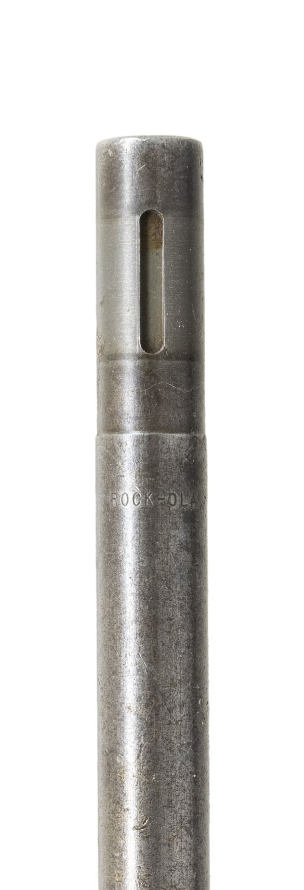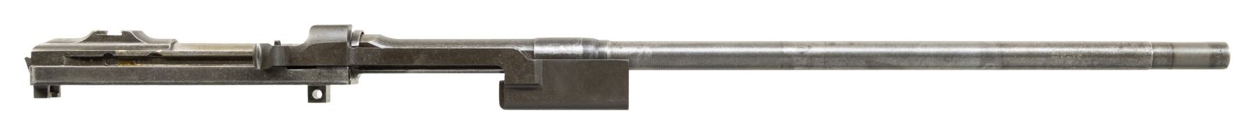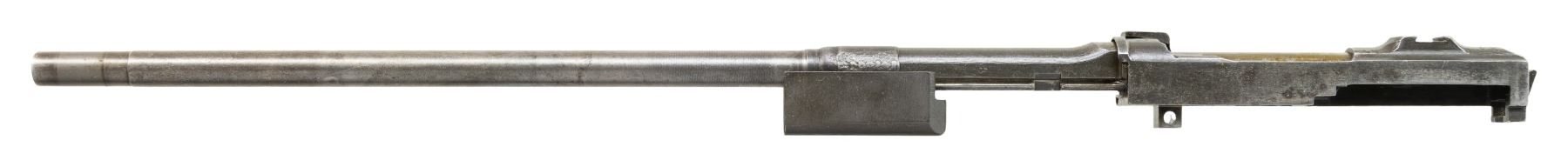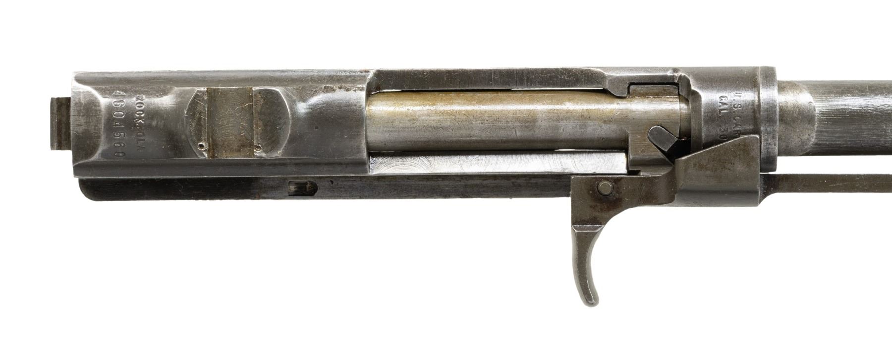 Cal. 30 Carbine. S# 4604560. Import marked on right side of barrel. Bbl. 18". Barrel marked behind front sight location "ROCK-OLA". Receiver is marked at heel "ROCK-OLA". Group consists of barreled receiver, gas piston and nut. Straight cut slide marked "ROCK-OLA" on the bottom and round bolt assembly marked "ROCK-OLA". No sights are fitted. CONDITION: barrel and receiver turning gray and patina with original finish in protected areas. Rear sight base has two punch marks. Slide has very little wear indicating possible arsenal rework black parkerized finish. Bolt has turned gray retaining little original finish with moderate wear. Good shiny bore with strong lands. (25-6275/RW). MODERN. $200-300.