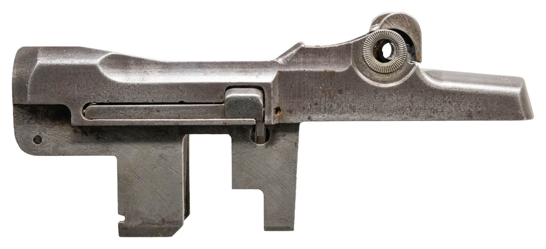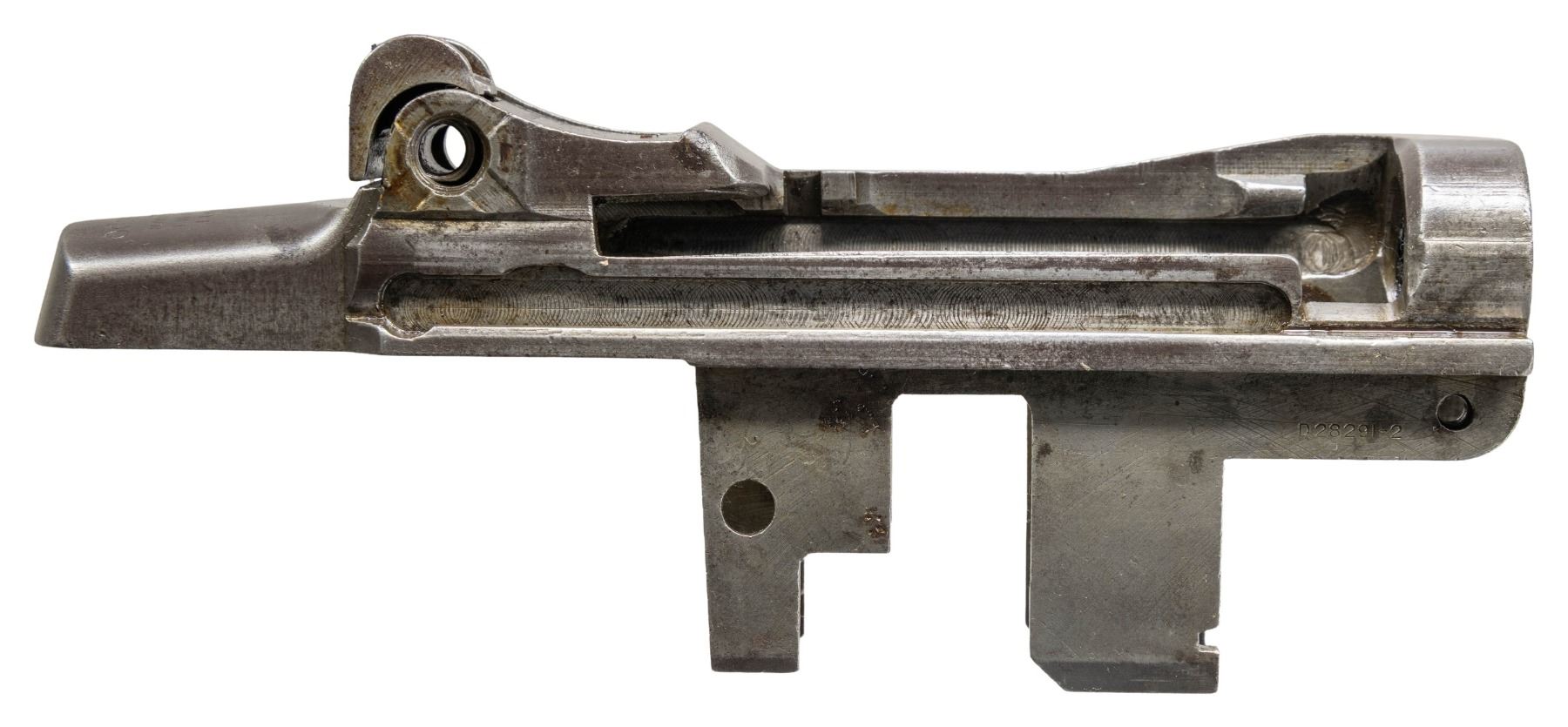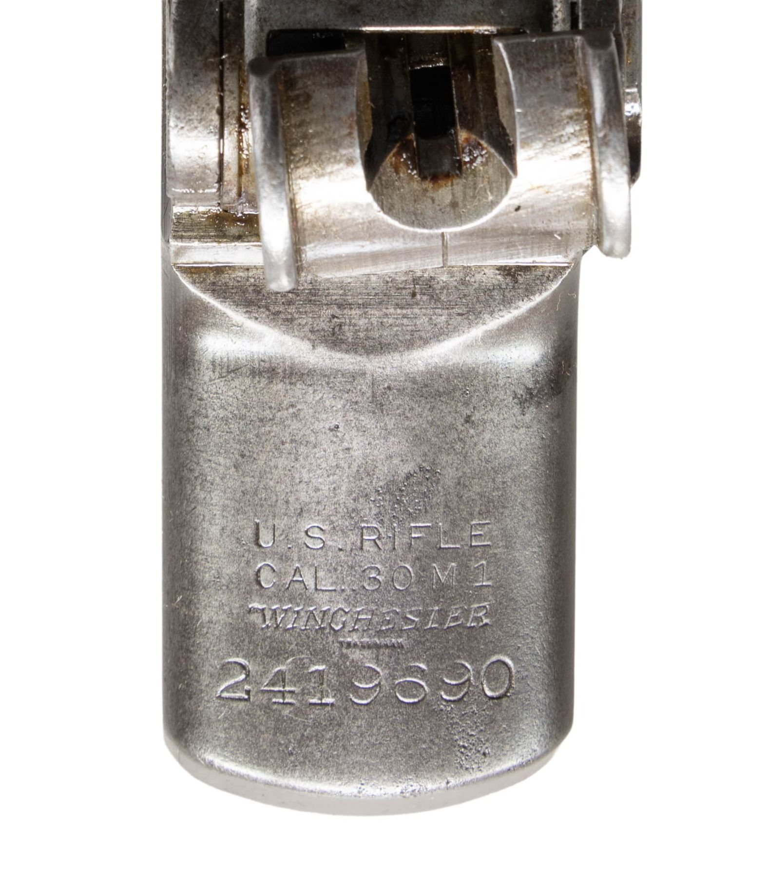 S# 2419690. Receiver marked at heel "U.S. RIFLE / CAL. .30M1 / WINCHESTER / serial number". Marked on right forward end "D28291-2". Receiver manufactured in 1944. Clip latch assembly, rear sight spring cover & sight base are present. CONDITION: well-worn receiver has turned overall gray w/ spots of very light pitting throughout. (25-2912/RW). MODERN. $300-500.