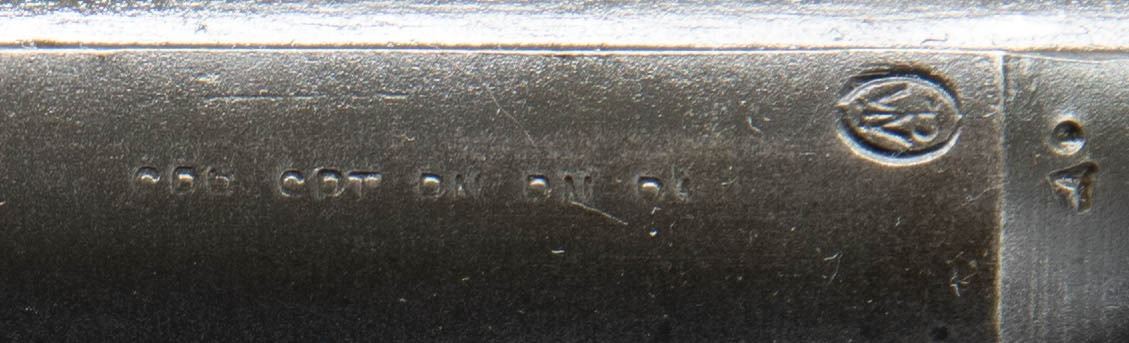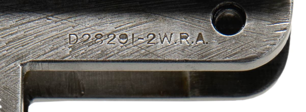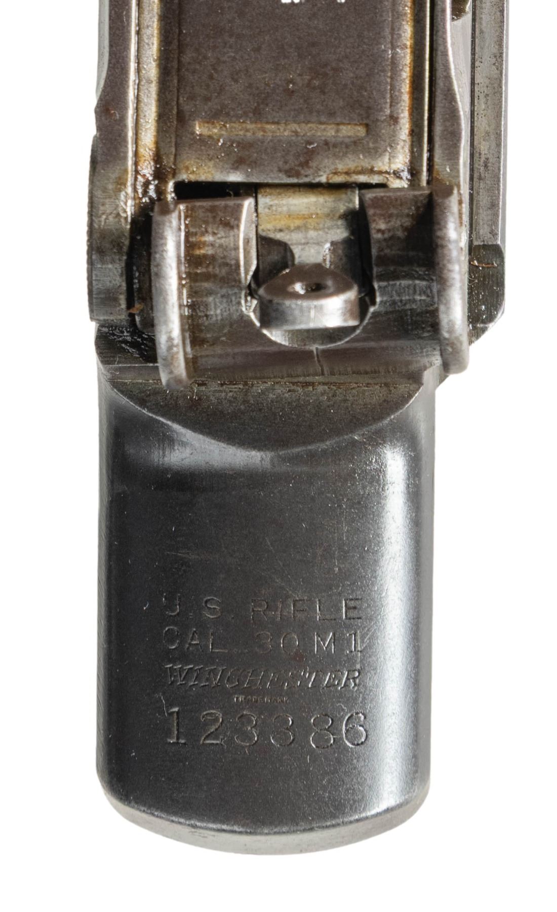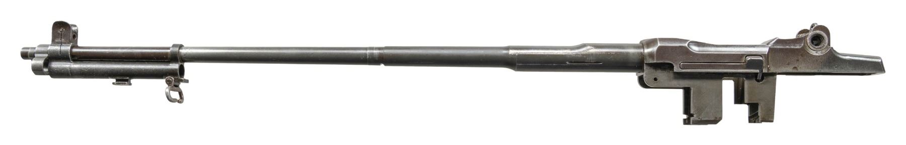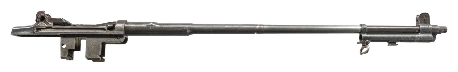 Cal. 30-06. S# 123386. Bbl. 24". No visible import marks. Throat gauges 3.0. Muzzle gauges 7.0. Barrel is marked on top w/ "D35448WRA". Marked on side w/ Winchester "P" proof. Receiver has clip latch installed. Rear sight, movable base & aperture are present. Barrel is equipped w/ gas cyl. which carries the blade front sight & stacking swivel. Gas cyl. is saw cut through sight dovetail. Gas cyl. lock is present. CONDITION: barrel & receiver have extensive wear retaining traces of original blue. Bore has worn lands turning dark in grooves. (25-2916/RW). MODERN. $200-400.
