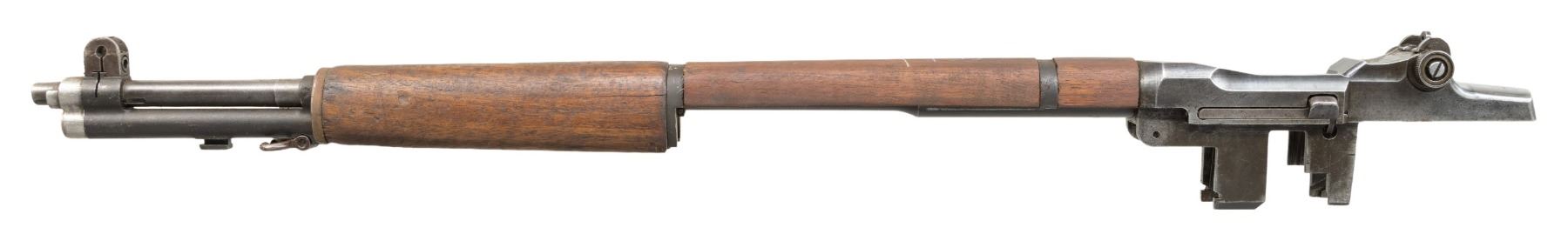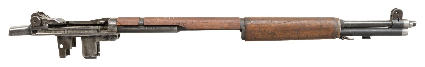 Cal. 30-06. S# 120128. Bbl. 24". Replacement barrel is marked "SA / 11 63". Throat gauges 6.0. Muzzle gauges 2.0. T105E1 aperture rear sight. Blade front sight with protective ears. 1941 production receiver marked on forward right side under wood-line "D28291-2 WRA". Clip latch is present. Receiver contains no additional parts. Gas cylinder lock and screw are present. Walnut front and rear handguards. Front handguard is well-worn original. Rear handguard is modern replacement. CONDITION: handguards have extensive wear, staining and handling marks. Front handguard has a number of cracks throughout. Worn receiver with handling marks and small spots of light pitting. Retains traces of its original blue finish. Balance of metal retains 50% of its worn parkerized finish. Bore has strong lands with lightly frosted grooves. (25-2993/RW). MODERN. $100-200.