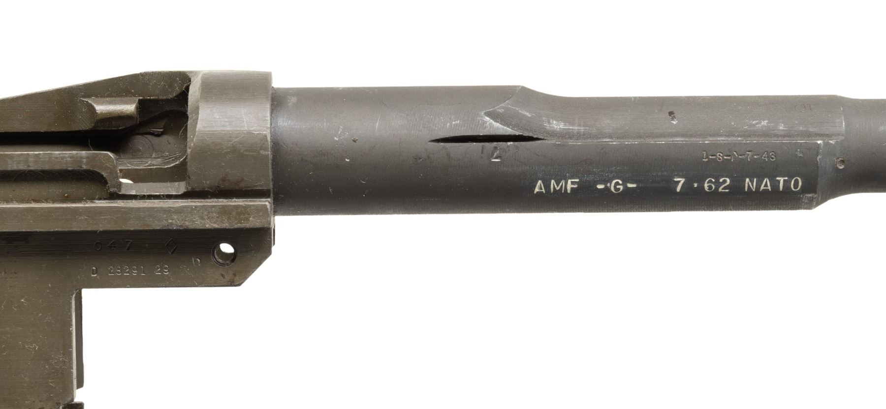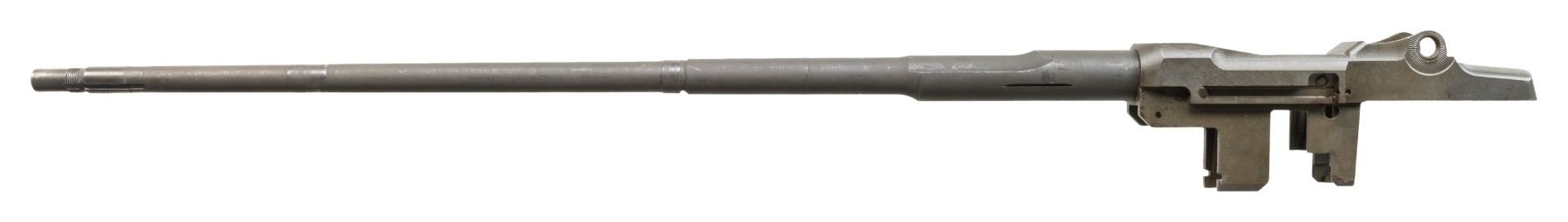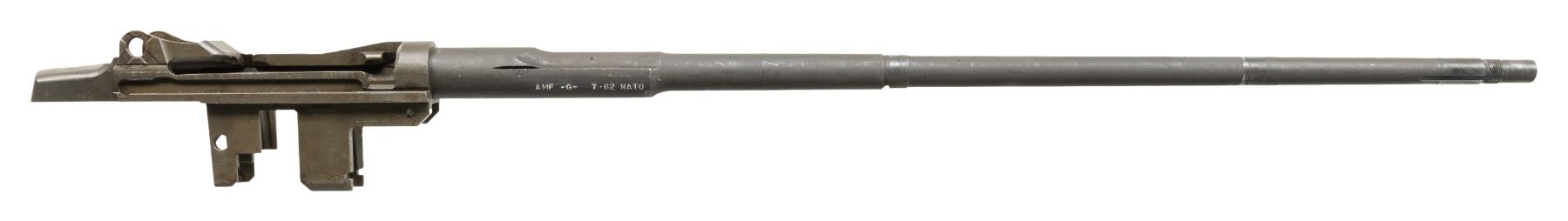 Cal. 7.62 NATO. S# 1765564. Bbl. 24". The barrel, which is marked on the right side "1-S-A-7-43" is also marked with white enhancement "AMF-G-7.62 NATO". The chamber has a sleeve inserted to accomplish the conversion to the 7.62 NATO cartridge from the original 30-06. This was done by American Machine and Foundry Corporation and was likely for the U.S. Navy. Receiver contains no additional parts. CONDITION: receiver and barrel retain 75% of their original finishes, the barrel having a darker and less reflective parkerizing. Very good shiny bore with strong lands. Light frosting appears at the muzzle end of bore. (25-2978/RW). MODERN. $100-200.
