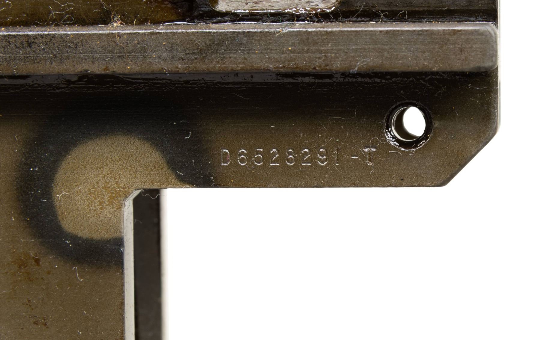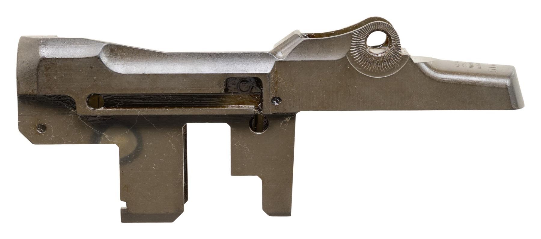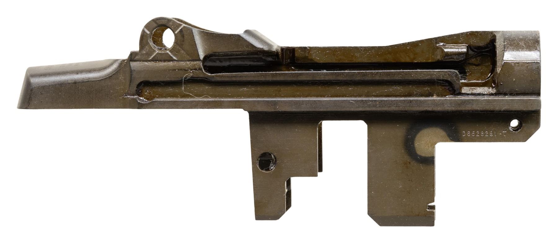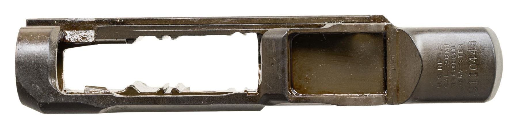 GARAND SEMI-AUTO MILITARY RIFLE RECEIVER. S# 5110448. Receiver contains no additional parts. Receiver is marked w/ standard International Harvester markings at heel & the drawing number "D6528291-T". CONDITION: receiver retains most of its arsenal rework parkerization over oxidation & scattered light pitting. Pitting is mostly under the wood-line. There are repaired cracks at the top of the right & left forward receiver legs showing approximately 1/2" diameter heat discolorations. (25-3059/RW). MODERN. $200-300.