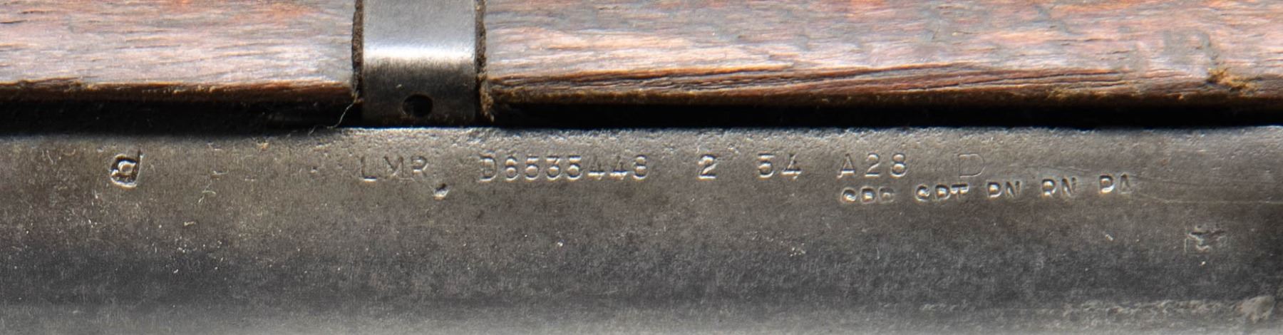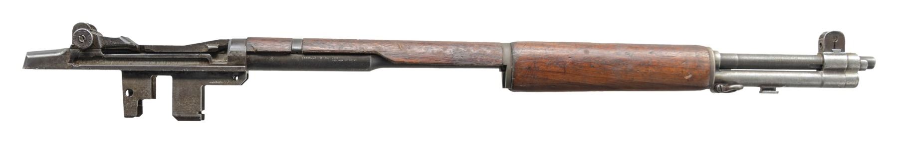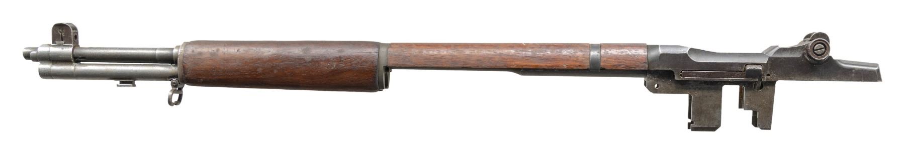 BARREL AND PARTS. Cal. 30-06. S# 5114093. Bbl. 24". Throat & muzzle gauges 2.0. Barrel markings on right side include "LMR 2 54" & import marks. Receiver carries standard markings at heel "D6528291-X" at right forward end. Receiver is fitted w/ clip latch & T105E1 rear sight. Barrel is fitted w/ walnut front & rear handguards w/ furniture. Barrel has gas cyl., front sight, stacking swivel, gas cyl. lock & lock screw. CONDITION: handguards have extensive wear, staining & small cracks. Metal is worn, turning gray w/ numerous areas of moderate pitting. Very prominent on opposite side of receiver. Dark oxidized bore. (25-3129/RW). MODERN. $200-300.
