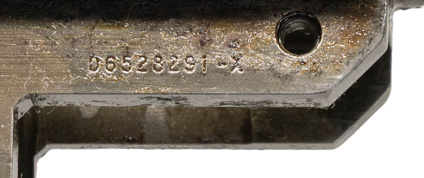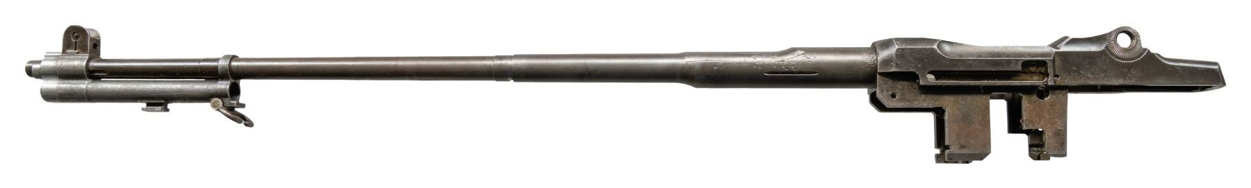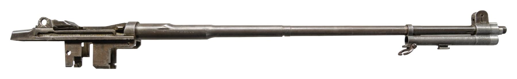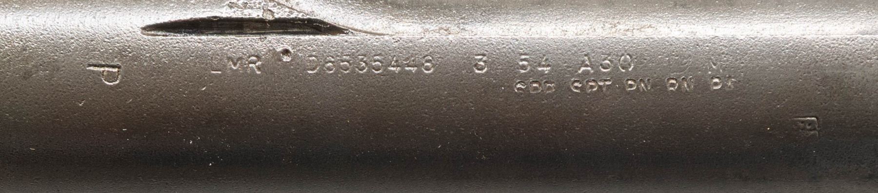 BARREL AND PARTS. Cal. 30-06. S# 5136209. Bbl. 24". Throat gauges 2.0. Muzzle 4.0. Barrel markings on right side include "LMR 3 54" & import marks. Receiver carries standard markings at heel "D6528291-X" at right forward end. Receiver has no additional parts. Barrel has gas cyl., front sight & stacking swivel. High hump gas cyl. lock. Cross slot gas cyl. lock screw. CONDITION: metal has wear, turning gray w/ areas of moderate pitting throughout. Bore has strong lands, turning dark in the grooves. (25-3135/RW). MODERN. $200-300.