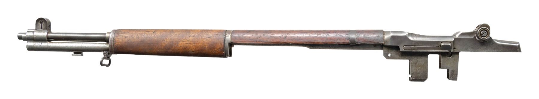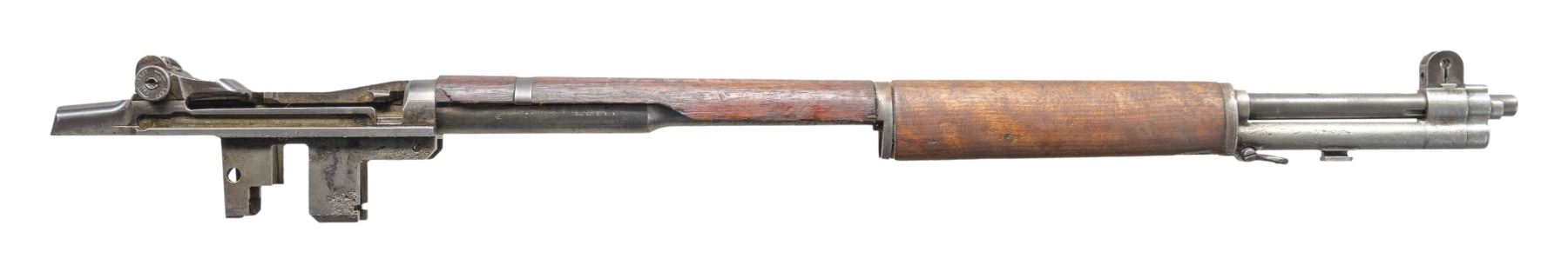 BARREL AND PARTS. Cal. 30-06. S# 5168338. Bbl. 24". Throat gauges 2.0. Muzzle gauges 3.0. Barrel markings on the right side include "LMR 2 54" & import marks. Receiver has standard markings at heel & has "D6528291-J" at right forward end. Receiver has T105E1 rear sight assembly & clip latch assembly, but contains no additional parts. Walnut front & rear handguards w/ no furniture. Gas cyl. carries blade front sight w/ protective ears & stacking swivel. High hump gas cyl. lock & cross slot gas cyl. lock screw. CONDITION: handguards have extensive wear, staining, small cracks & soldier initials. Metal is well-worn, turning gray w/ areas of oxidation & moderate pitting throughout. Fair worn bore turning dark. (25-3144/RW). MODERN. $200-300.