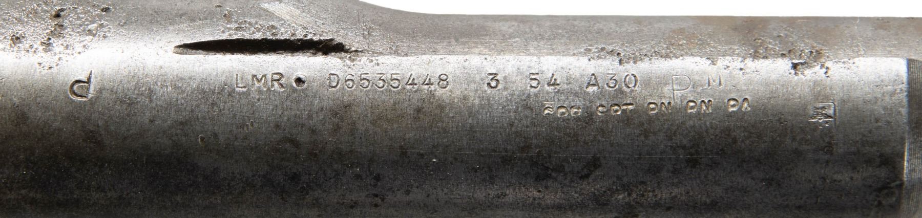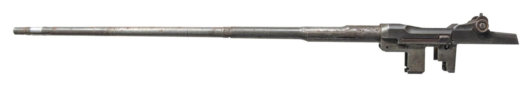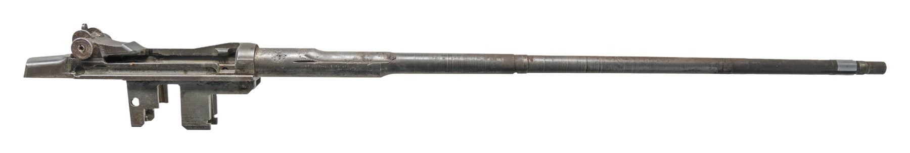 RECEIVER. Cal. 30-06. S# 5137512. Bbl. 24". Throat gauges 2.0. Muzzle gauges 1.0. Barrel markings on right side include "LMR 3 54" & import marks. Receiver carries standard markings at heel "D6528291-X" at right forward end. Receiver equipped w/ clip latch assembly & T105E1 rear sight. Barrel & receiver contain no additional parts. CONDITION: receiver, barrel & sight have extensive wear turning gray w/ areas of oxidation & moderate to severe pitting. Pitting is most notable over chamber of barrel. Dark oxidized bore w/ slight bulge 11" behind muzzle. (25-2990/RW). MODERN. $100-200.