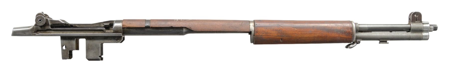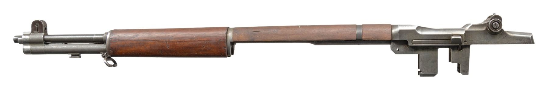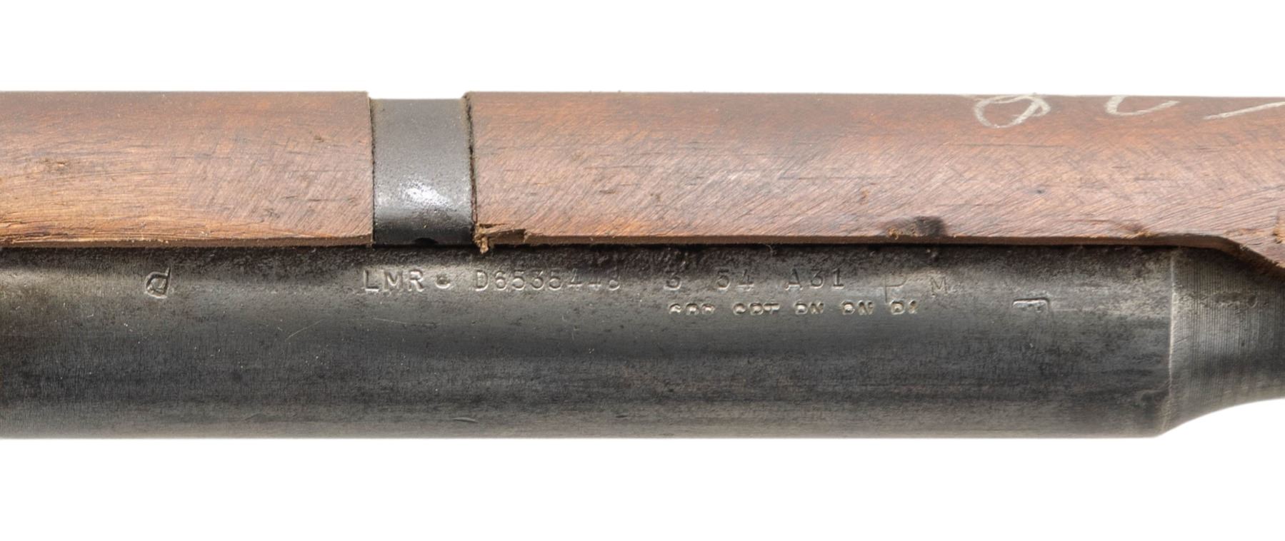 BARREL AND PARTS. Cal. 30-06. S# 5135174. Bbl. 24". Throat gauges 3.0. Muzzle gauges 5.0. Barrel markings on right side include "LMR 5 54" & import marks. Receiver carries standard markings at heel & "D6528291-X" at right forward end. T105E1 aperture rear sight. Blade front sight w/ protective ears. Walnut front & rear handguards w/ furniture. Rear handguard is arsenal replacement. Gas cyl., lock & screw are present. Receiver is equipped only w/ the clip latch assembly. CONDITION: front handguard in good serviceable condition w/ arsenal rework finish. Rear handguard shows sanding marks. Metal is well-worn, turning gray & patina w/ areas of oxidation & moderate pitting. Dark worn bore. (25-2995/RW). MODERN. $100-200.