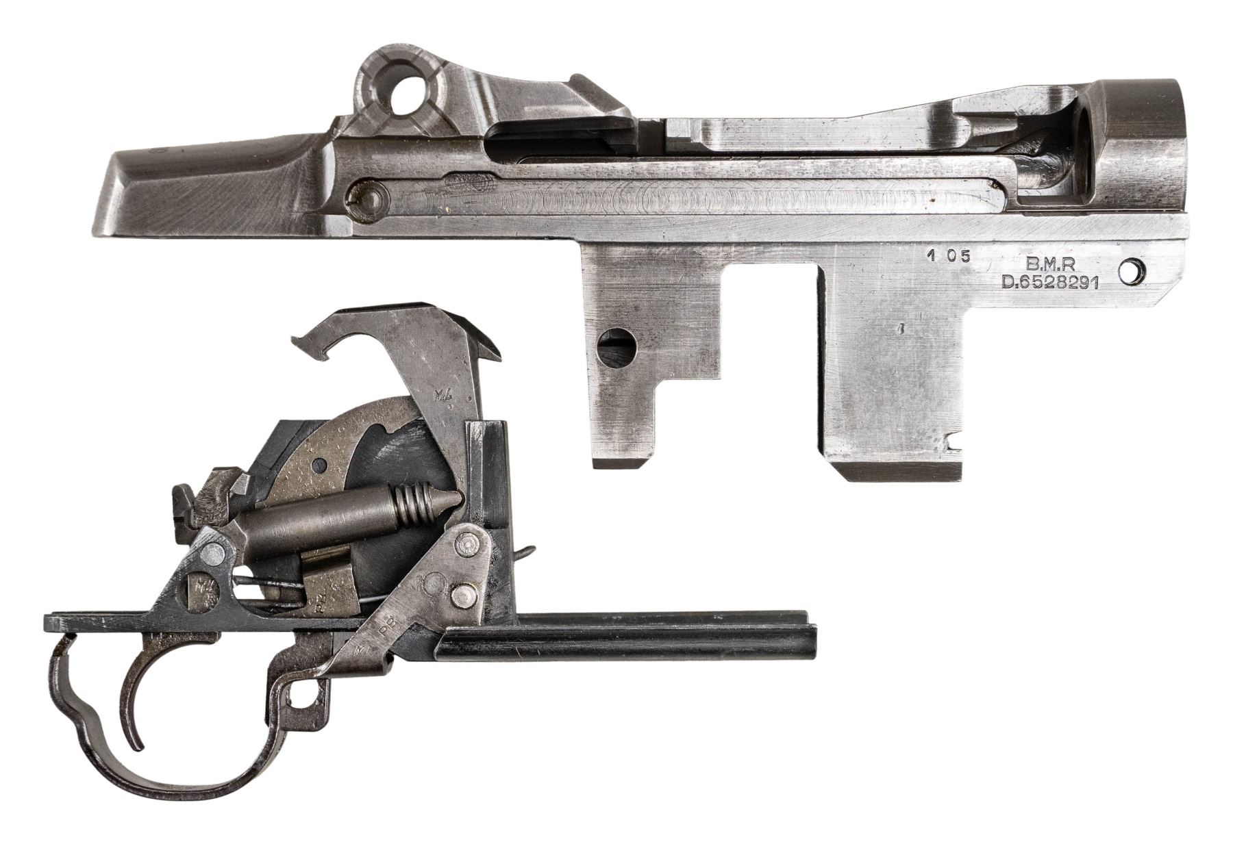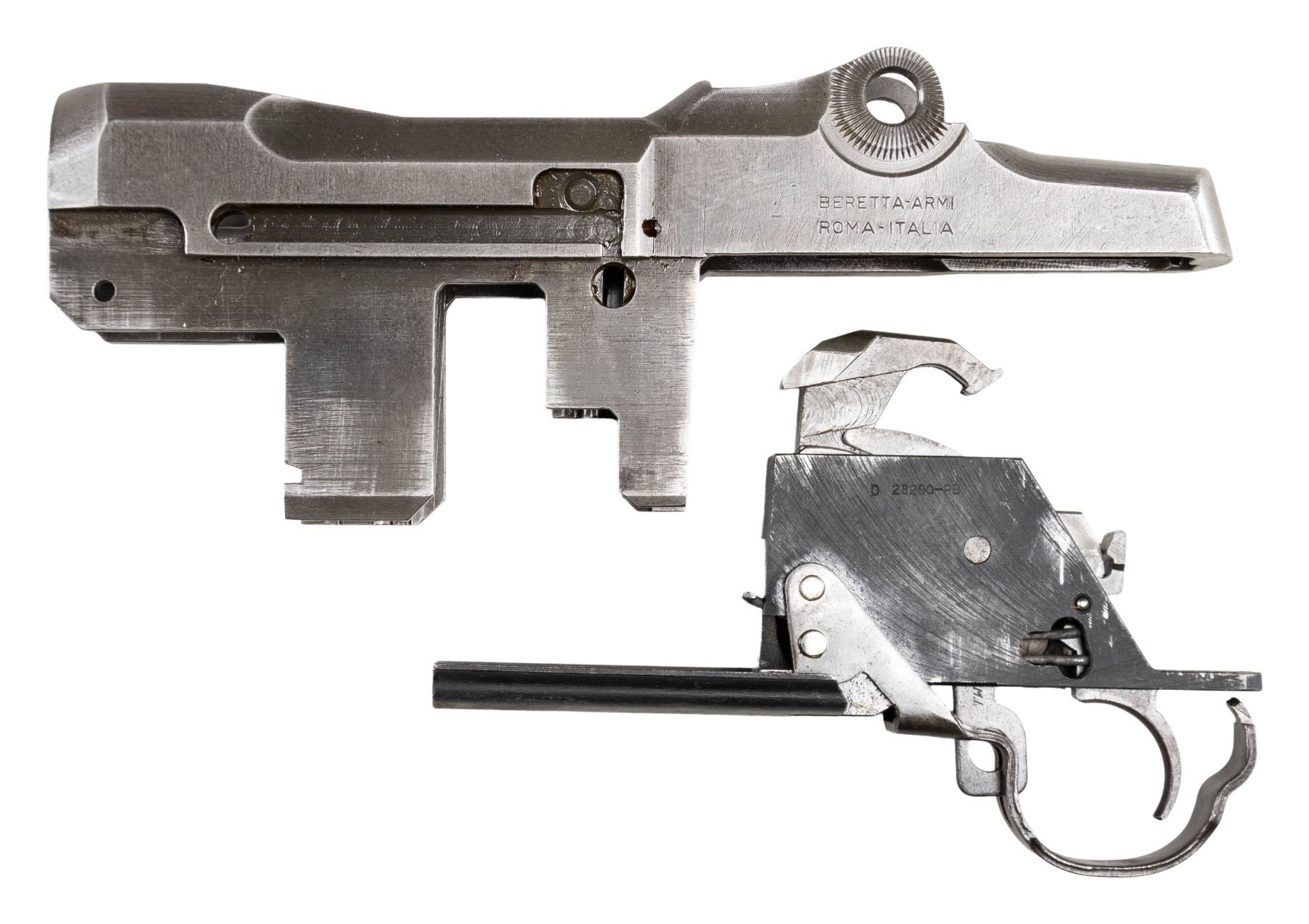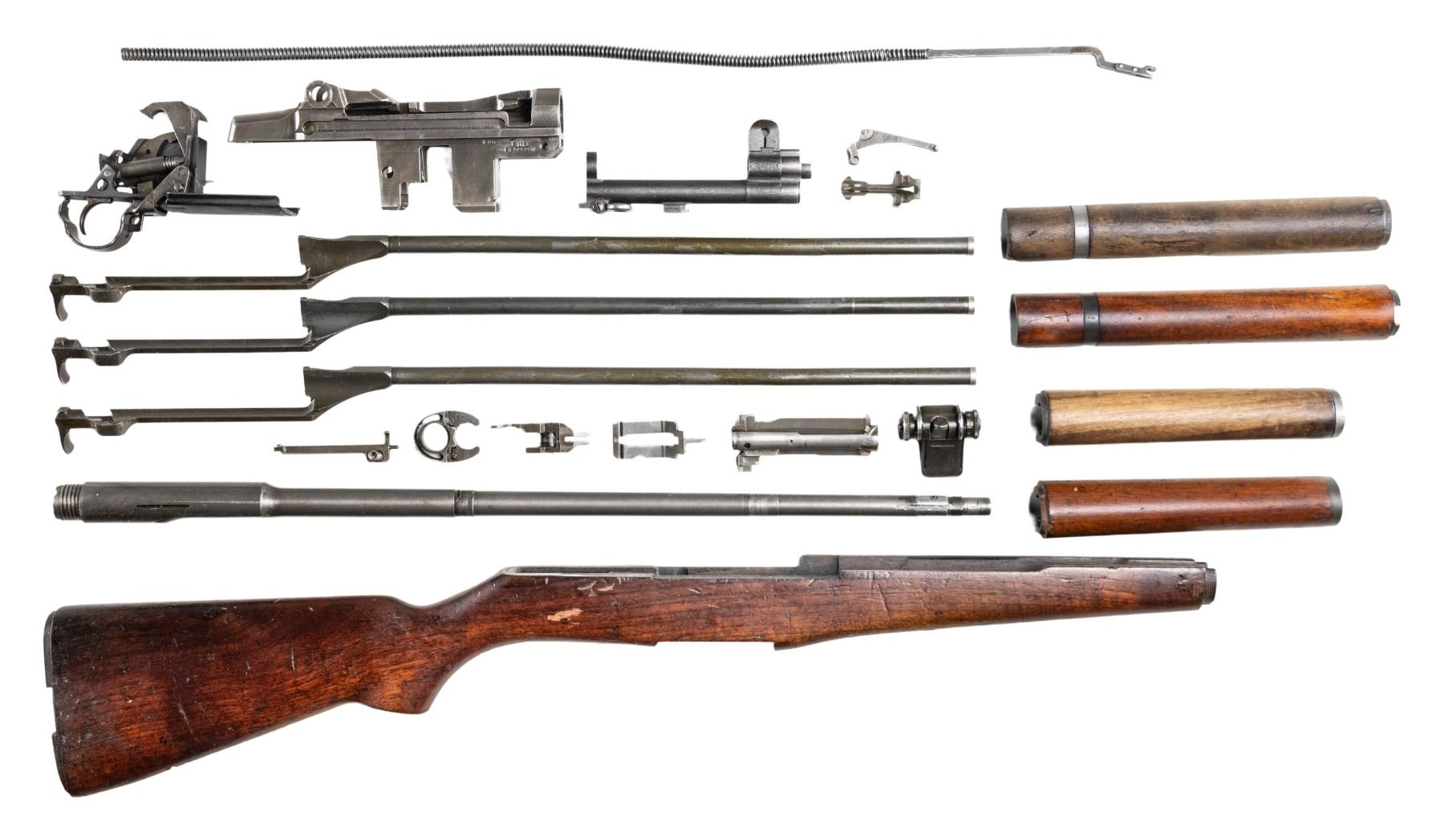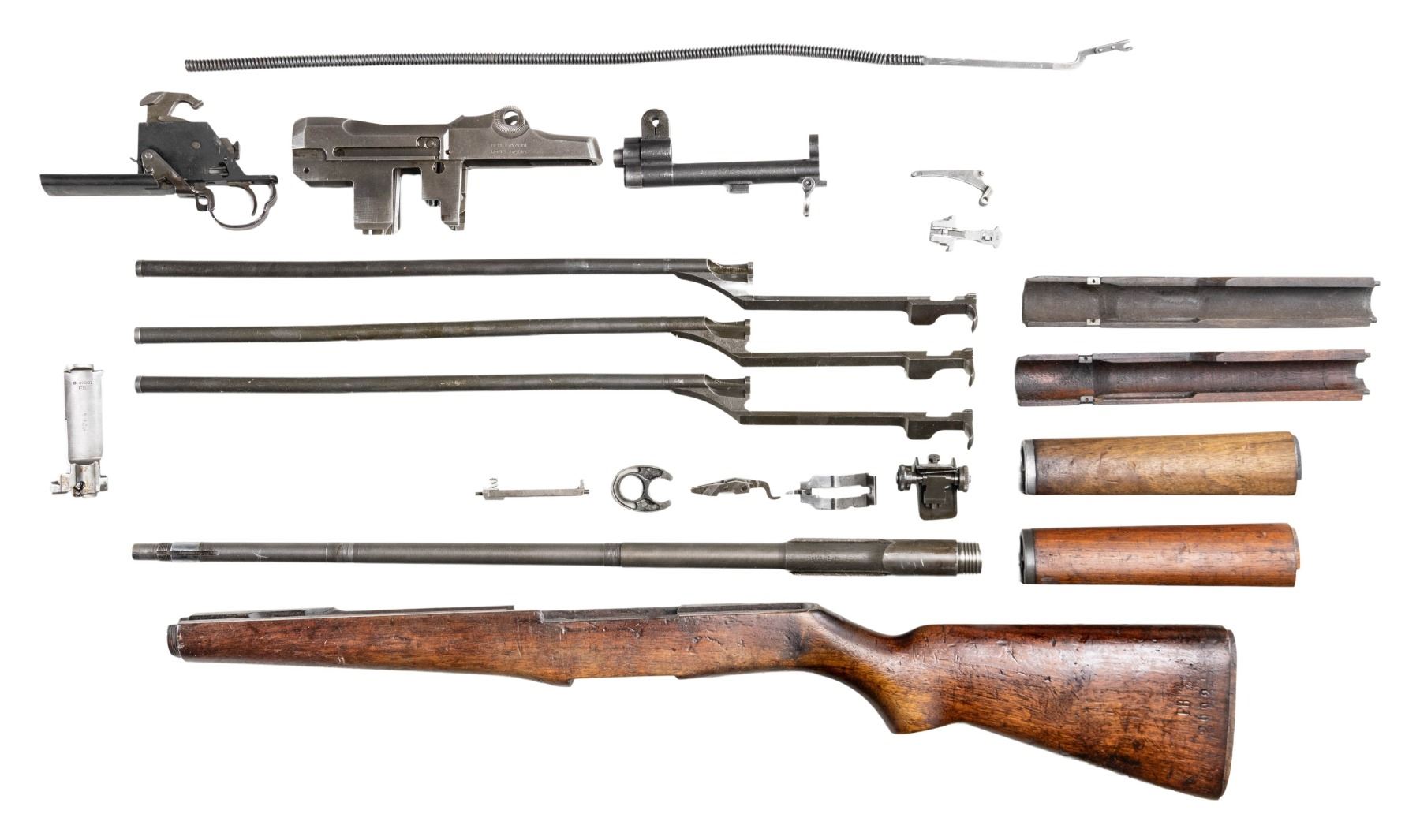 AUTO MILITARY RIFLE. Cal. 30-06. S# PB9909. Bbl. 24". Dated "PB" and marked "1955". The rifle is its unassembled form is based on a Beretta made receiver which is marked at heel with the Danish crown, "FKF" and serial number. Marked on left side below rear sight "BERETTA-ARMI / ROMA-ITALIA". Marked on right forward side "BMR" & drawing number. All parts markings are "PB" including the bolt, which is electro-penciled to match the receiver. The following parts are observed to be present: trigger group assembly with stamped trigger guard. T105E1 rear sight assembly. Gas cylinder assembly with blade front sight. High hump gas cylinder lock and cross slot gas cylinder lock screw, stacking swivel, milled barrel band, follower, follower arm, clip latch assembly, accelerator, operating rod catch and bullet guide, three operating rods, one long fork follower rod with recoil spring. Walnut stock parts include buttstock with non-matching serial number. Danish sight setting decal is present in barrel channel. Two front and two rear handguard assemblies and two rear handguard assemblies. Parts not present are buttplate assembly, rear swivel, follower arm pin, stock ferrule, extractor, extractor spring, firing pin and clip latch spring. CONDITION: stock parts are well-worn with numerous handling marks over original finish. Rear handguards have notable small cracks and missing chip. One rear handguard set has notably less finish than the other. Metal parts retain an average of 50% original finish with wear and handling marks. Receiver has notably gray appearance. Fair worn bore with frosted grooves. (25-2965/RW). MODERN. $400-600.