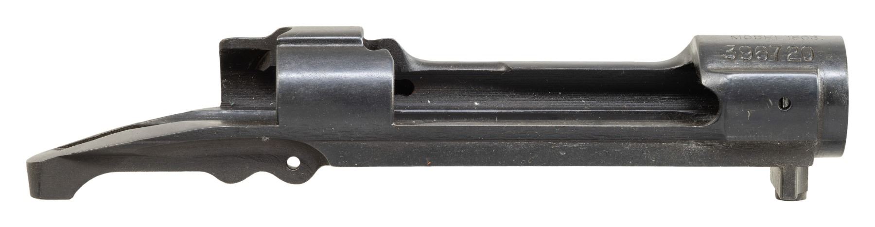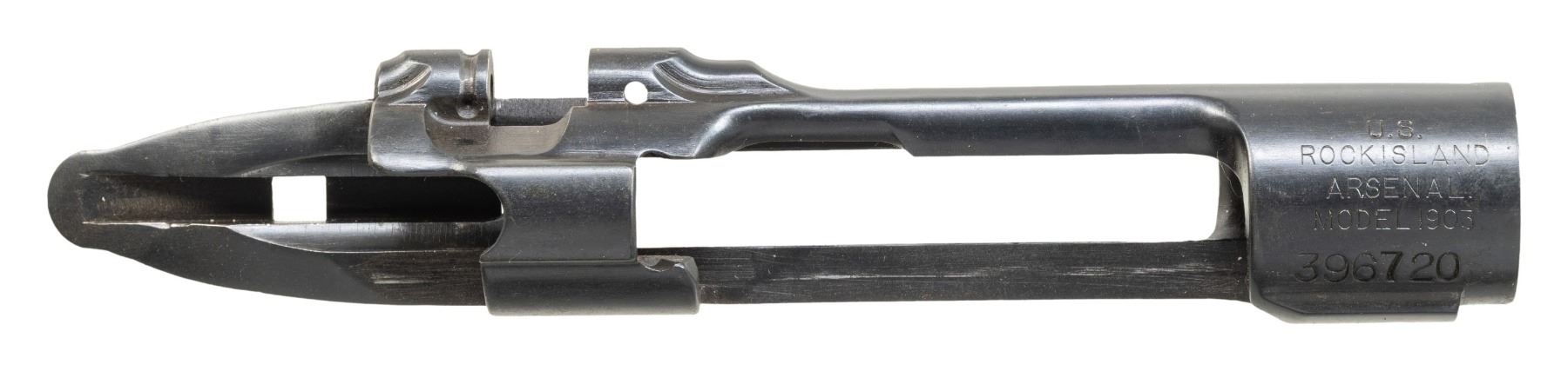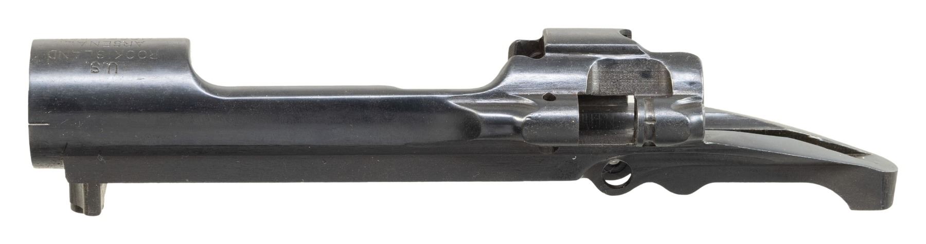 1903 RECEIVER. S# 396720. Receiver is marked on forward edge of ring in the seven o'clock position "NS" indicating its manufacture from nickel steel, making this a desirable receiver. Receiver is marked on top "U.S. / ROCK ISLAND / ARSENAL / MODEL 1903". Receiver does not have Hatcher hole. No additional parts included. CONDITION: receiver retains most of its professional reblue with light wear throughout. (25-3002/RW). MODERN. $200-400.