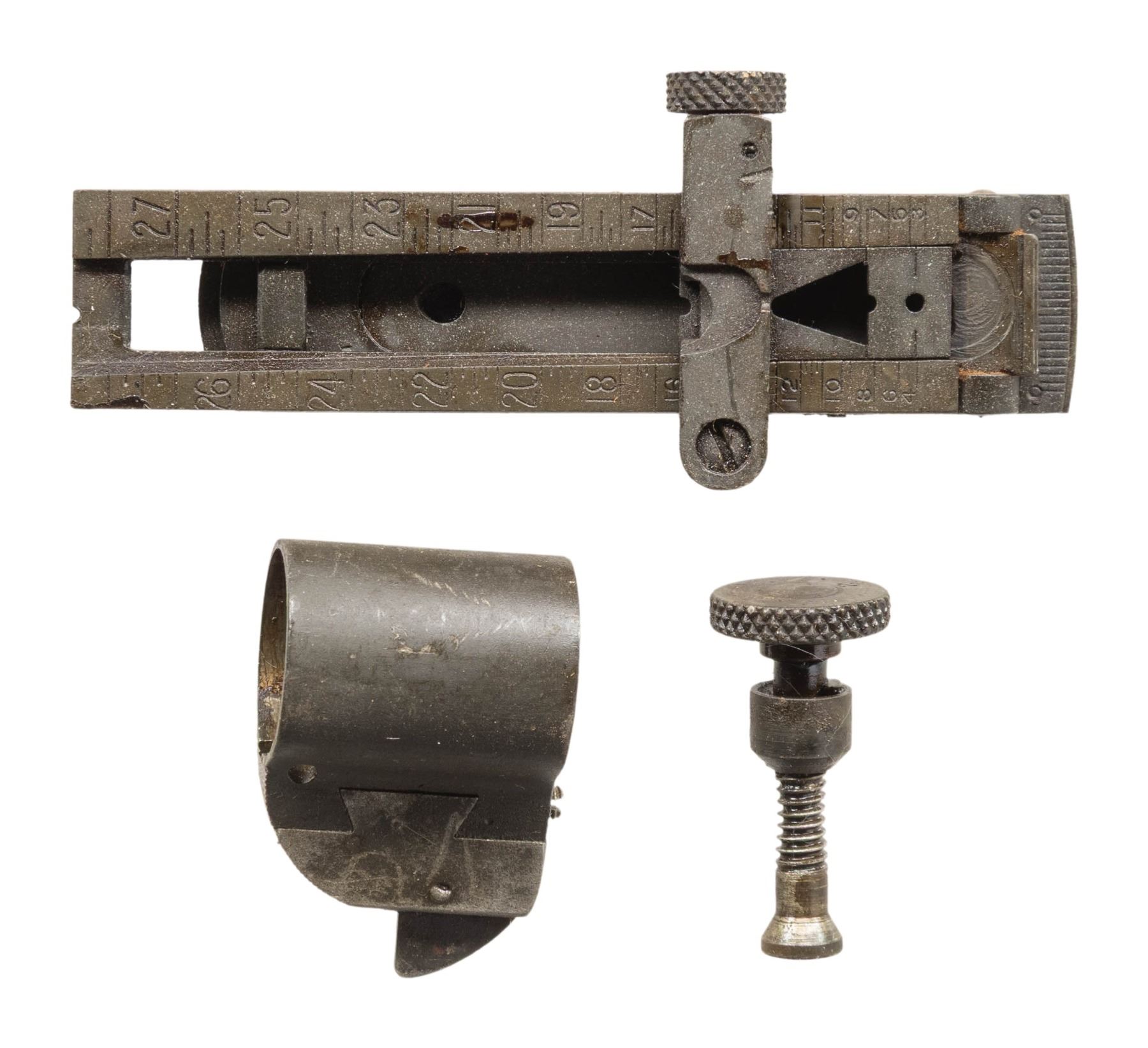 RECEIVER. S# 1526931. Barrel is not present, but most additional parts to assemble a complete rifle are. The receiver has the appearance of an added digit or digits to the serial number as has been done to create a "High Number Springfield". The receiver and bolt have had extensive welds removed from what was likely a drill rifle. The welds were made inside the magazine well to make the receiver and bolt one solid unit and were later removed by extensive grinding. The welding would likely have altered the heat treatment of both receiver and bolt. Receiver has two holes drilled and tapped on top of the ring. Holes have been plugged. Cutoff and trigger assembly are functional. Complete unmarked bolt with straight down handle. Magazine spring and follower are not present. Ladder rear sight and windage screw and blade front sight with two piece base is present. Large bow stamped "REMINGTON / 03-A3 / TRIGGER GUARD" with guard screws. Straight grip "S" type walnut stock with handguard. All milled furniture including smooth trap buttplate. Buttplate has the chiseled indentations common on the rifles used by the United States Marine Corps. CONDITION: stock set has an arsenal rework finish with loss of wood in inletted areas and extensive wear, staining and handling marks throughout. Notable large chip missing from right heel. Notable cracks at buttplate tang, receiver tang and front of handguard. Metal furniture has a worn parkerized finish. Trigger guard retains 50% of its blued finish. Receiver and bolt has a moderately parkerized finish. Grinding due to removal of welds, appearing hurriedly done and is in the white. (25-2859/RW). MODERN. $200-300.