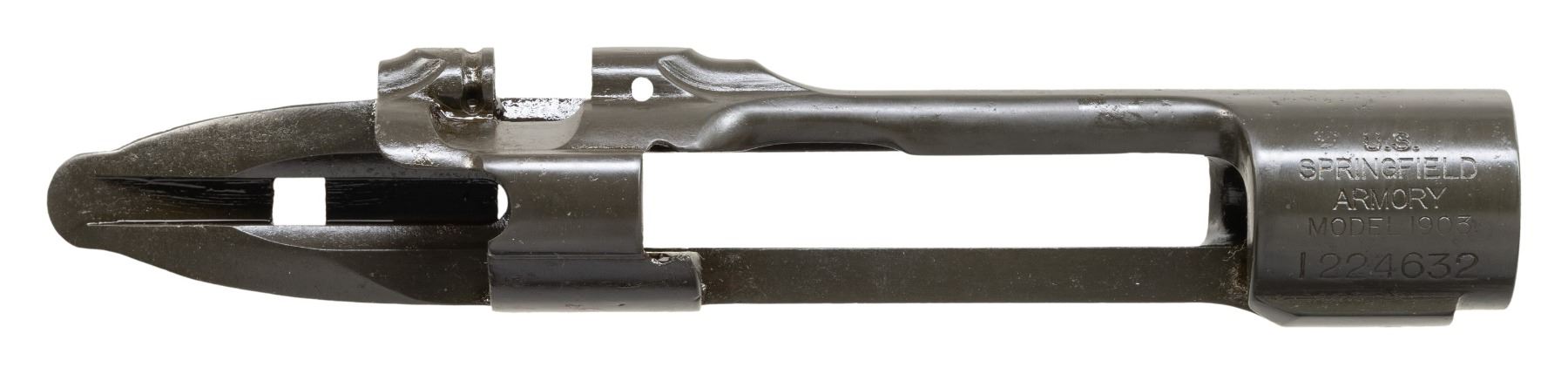 S# 1224632. Receiver manufactured in 1921 and marked "J74" on front edge of receiver ring which would be under the barrel shoulder when assembled to rifle. Receiver marked "U.S. / SPRINGFIELD / ARMORY / MODEL 1903". Receiver contains no additional parts. CONDITION: receiver contains 99% of its arsenal rework parkerized finish over moderate pitting. Pitting is notable on left side above and below wood-line. (25-3005/RW). MODERN. $100-200.