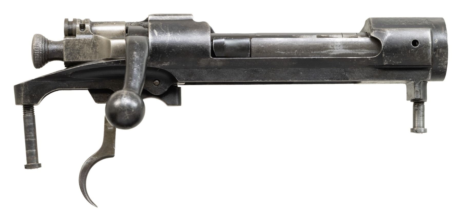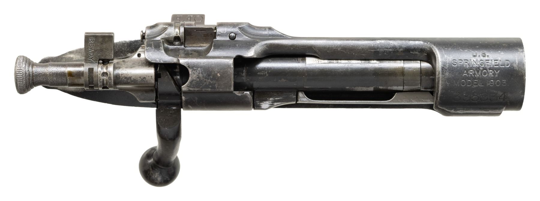 S# 335834. Receiver manufactured in 1907. Receiver is marked on top with "U.S. / SPRINGFIELD / ARMORY / MODEL 1903". Receiver is equipped with Model 1903-A3 bolt assembly. Bolt is marked "R4" on top. Trigger assembly with narrow smooth trigger, cutoff assembly and Guard screws are present. CONDITION: receiver has the remains of a matte black finish with thinning and moderate wear. Bolt retains 50% of its wartime black parkerized finish with moderate wear. (25-2973/RW). MODERN. $100-200.