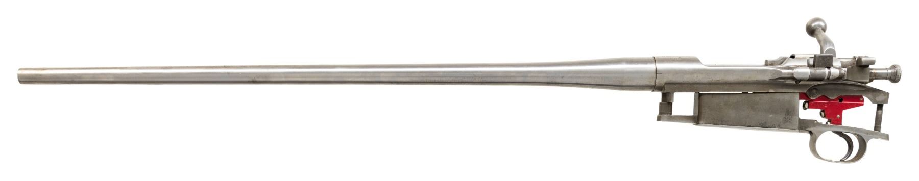 Cal. 30-06. S# 1237456. Bbl. 23 1/2". Unmarked barrel finished in the white. Single front sight mounting hole approximately 7/8" behind muzzle. Receiver has had most of its finish removed and is drilled for a receiver sight on the right side of the bridge. Fully adjustable Timney single stage sporting trigger. Bright bolt with early straight down handle. Milled trigger guard assembly. CONDITION: metal is mostly in the white with wear and staining. Very good shiny six groove bore. (25-2982/RW). MODERN. $100-200.