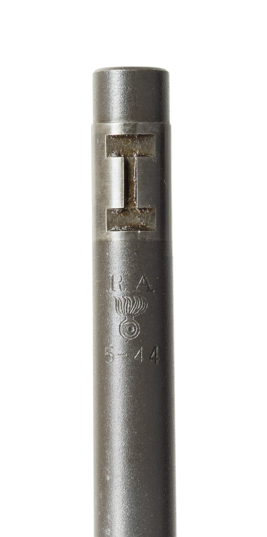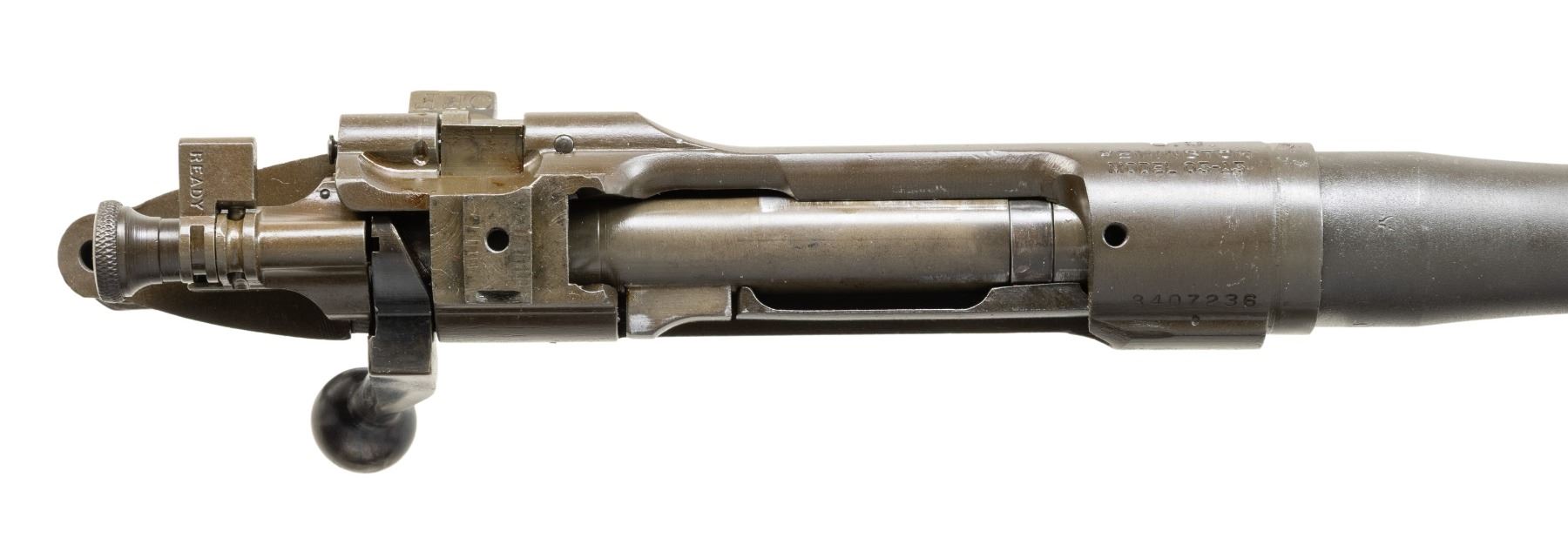 Cal. 30-06. S# 3407236. Bbl. 24". Barrel is marked "RA / flaming bomb / 5-44". Rifle has been assembled using a correct Model 1903-A4 receiver. These receivers with their model markings offset to the left to clear the scope mount, were actually marked "MODEL 03-A3" in-case they were needed to assemble conventional rifles. This receiver is drilled and tapped on top of two screw holes for the military one piece scope base. The Remington marked bolt assembly has had the handle altered to clear a telescopic sight. Receiver has the notched bolt handle seat. The front sight has been removed from the barrel. Stamped correct Remington large bow trigger guard. CONDITION: metal retains nearly all of its arsenal rework type parkerized finish with only very light hi-point wear. Bolt handle has been blued. Very good shiny two groove bore. (25-2921/RW). MODERN. $100-200.