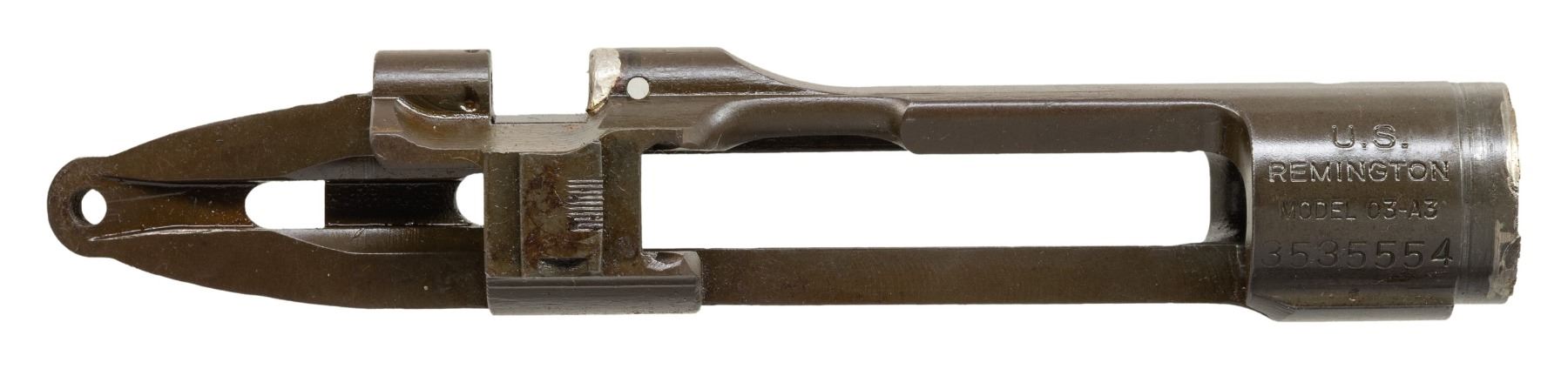 S# 3535554. Receiver re-purposed from drill rifle. Receiver ring has partly removed arc welding on top forward edge of receiver ring. There is additional welding on the forward edge of the cutoff recess. Receiver marked "U.S. / REMINGTON / MODEL 03-A3" with visible assembly numbers. Receiver contains no additional parts. CONDITION: receiver retains 90% of its arsenal rework parkerization except the wells retain a bright finish. (25-6255/RW). MODERN. $100-200.