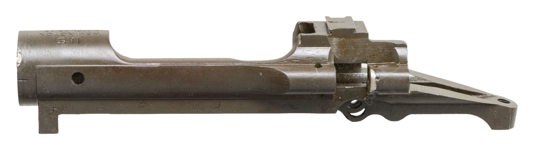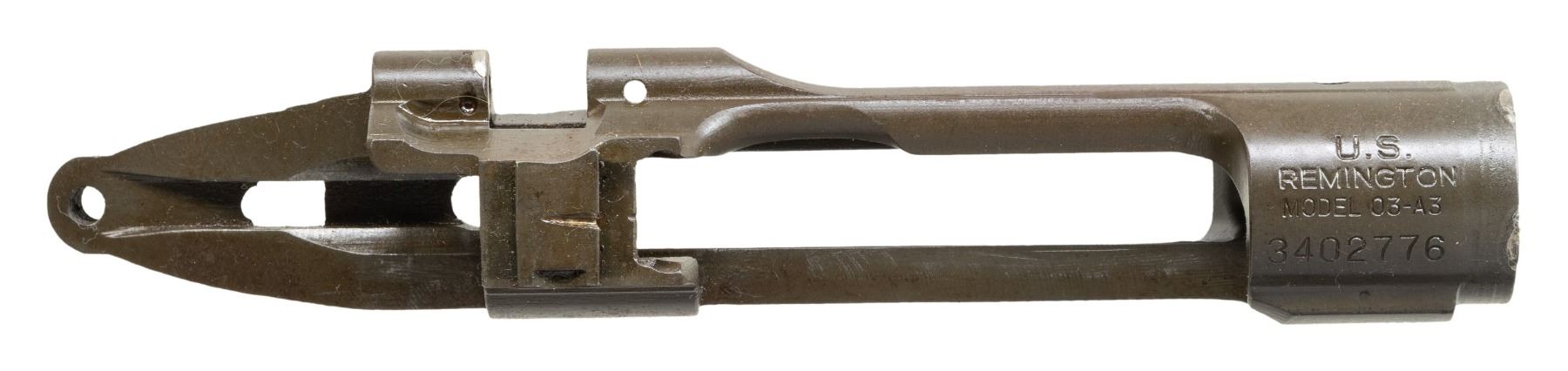 S# 3402776. Receiver likely re-purposed from drill rifle. Top front edge of receiver ring has evidence of arc-welding. Arc welding is also present on the rear of the cutoff recess. Receiver marked "U.S. / REMINGTON / MODEL 03-A3". Sight dovetail has single notch. No additional parts included. CONDITION: receiver retains 85% of its original parkerized finish with light wear. (25-6248/RW). MODERN. $100-200.