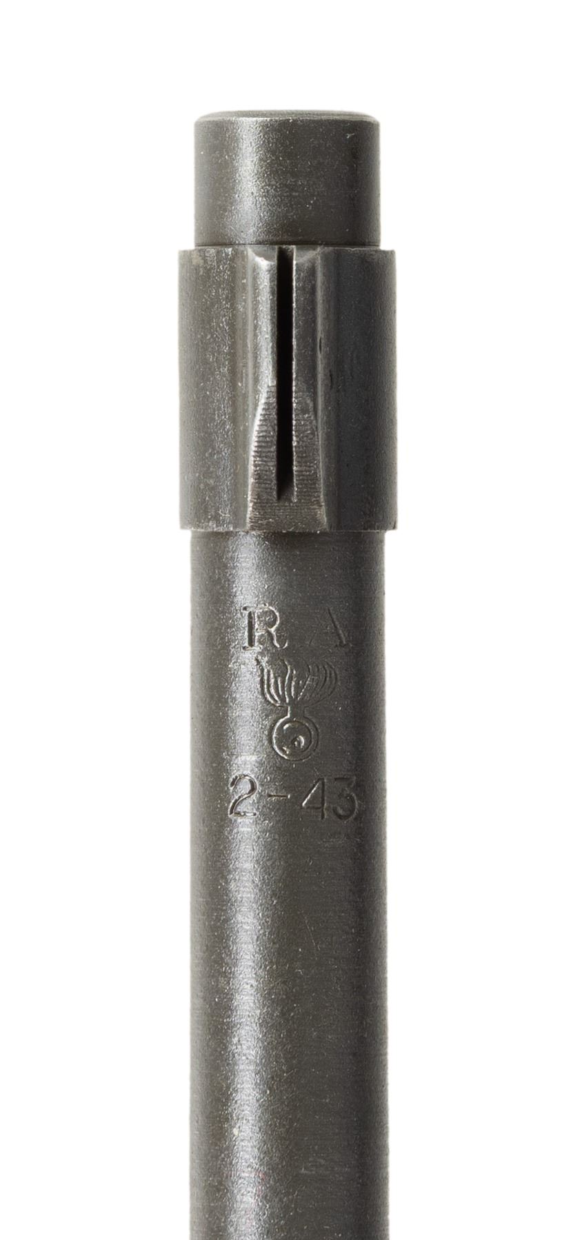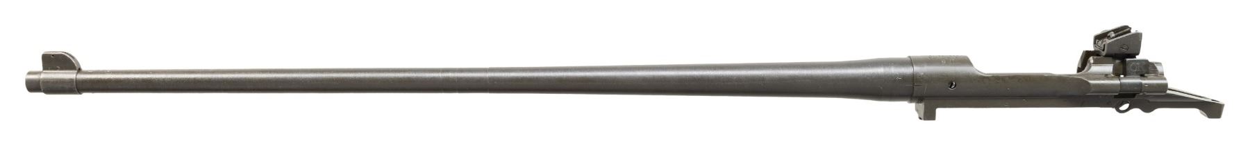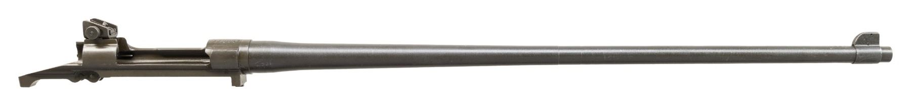 Cal. 30-06. S# 3443057. Bbl. 24". Barrel is marked behind front sight "RA / flaming bomb / 2-43". Adjustable aperture rear sight graduated to 800 yards. Front sight base is present on barrel. Sight blade is not present. Cutoff assembly is installed on receiver. No other parts are present. Receiver has clear crisp markings including assembly numbers. CONDITION: rear sight and cutoff blue. Balance of metal has arsenal rework parkerization with light hi-point wear. Near excellent shiny bore. (25-3068/RW). MODERN. $100-200.