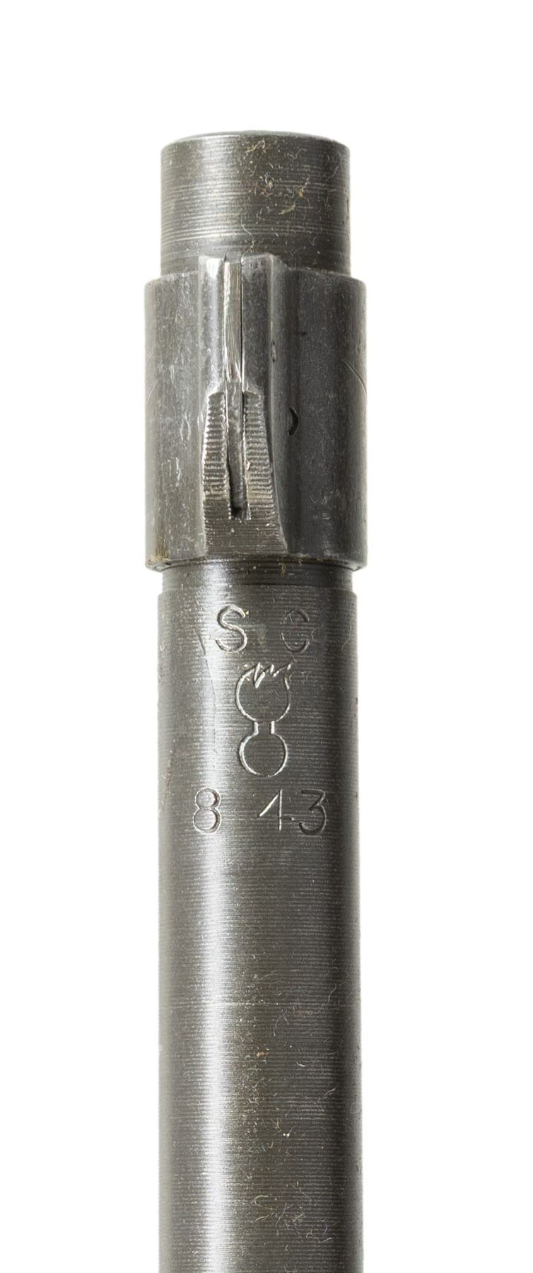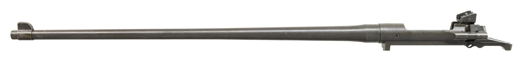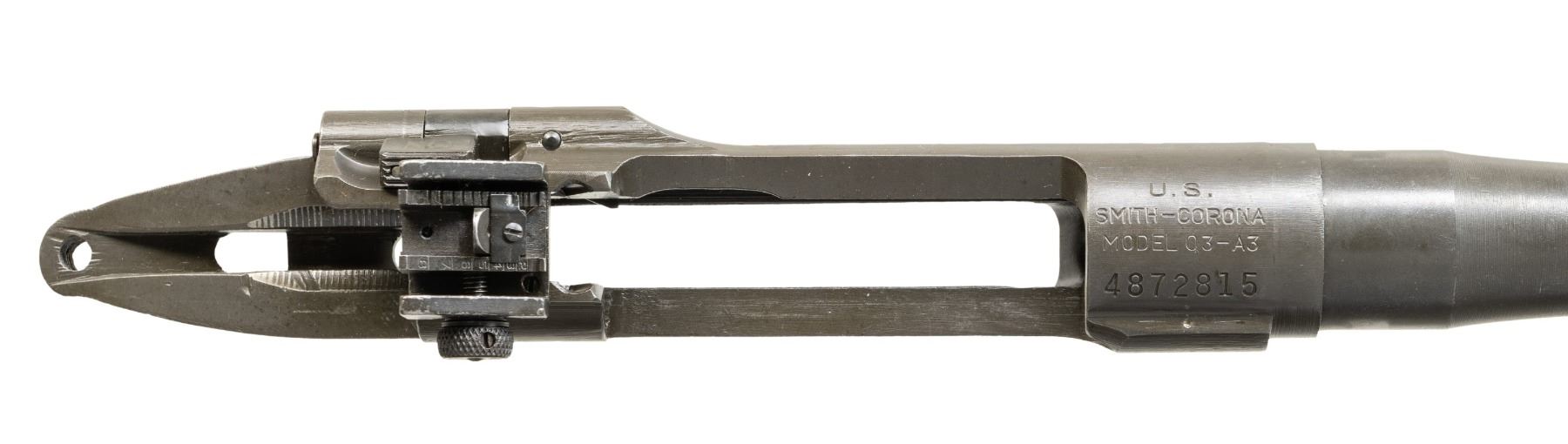 Cal. 30-06. S# 4872815. Bbl. 24". Marked behind front sight "SC / flaming bomb / 8-43". Aperture rear sight graduated to 800 yards. Front sight base is present. Sight blade has been ground flush with base. Receiver is marked on top "U.S. / SMITH-CORONA / MODEL 03-A3". Cutoff assembly is present. Receiver contains no other parts. CONDITION: entire assembly retains 90% of its lightly worn arsenal rework parkerization. Very good shiny four groove bore. (25-3065/RW). MODERN. $100-200.