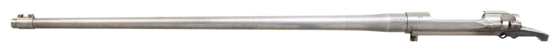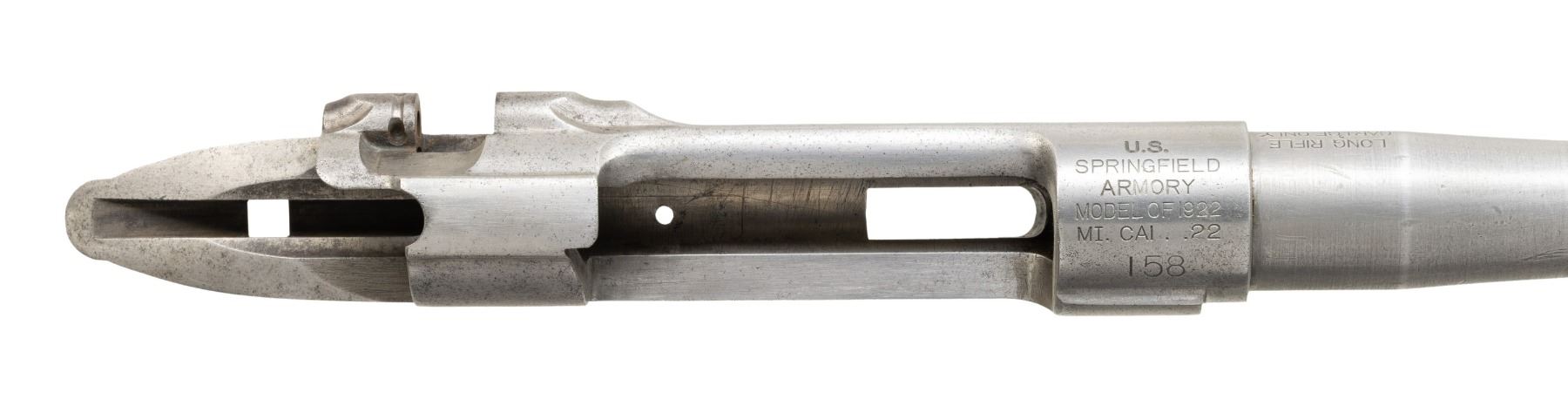 Cal. 22 LR. S# 158. Bbl. 24". Barrel marked behind front sight base "S.A. / flaming bomb / 11-28". Receiver is marked on top "U.S. / SPRINGFIELD / ARMORY / MODEL 1922 / M1. CAL. .22". Barrel is marked "LONG RIFLE / CART'GE ONLY". No sights are fitted except for front sight fixed base. Receiver carries no additional parts. CONDITION: receiver and barrel are in the white with scattered spots of oxidation and fine pitting with small handling marks. Receiver has more notable handling marks. Good bore with lightly worn lands. (25-3112/RW). MODERN. $200-300.